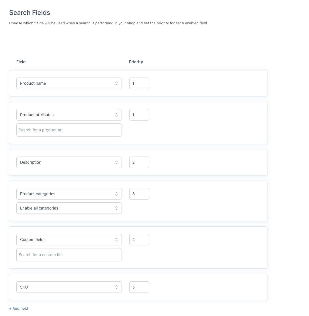 Definisci in quali parametri dei tuoi prodotti verrà attivata la ricerca: nome, descrizione, SKU, attributi, categorie, ecc. Configura inoltre per ogni parametro la priorità, affinché i risultati più attendibili siano sempre mostrati all’inizio.