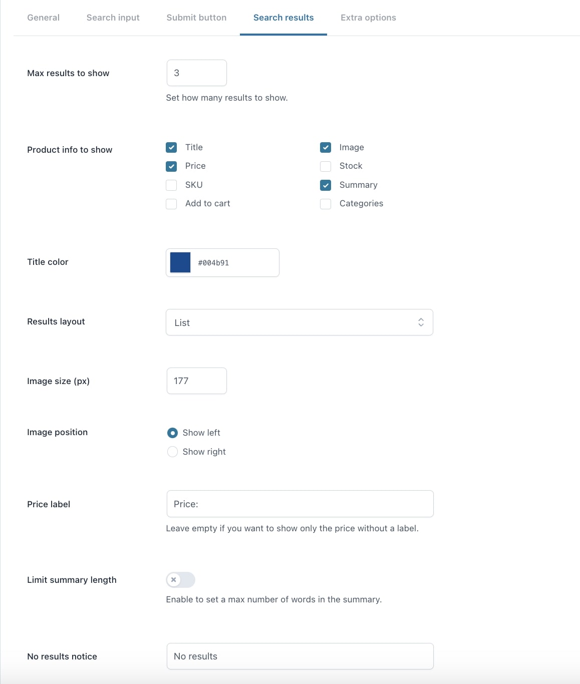 Dall’arrotondamento e lo spessore dei bordi ai colori, dallo stile del pulsante al testo da mostrare nel modulo di ricerca: nel plugin troverai decine di opzioni per personalizzare la ricerca e renderla adatta al tuo brand e al design del tuo e-commerce.