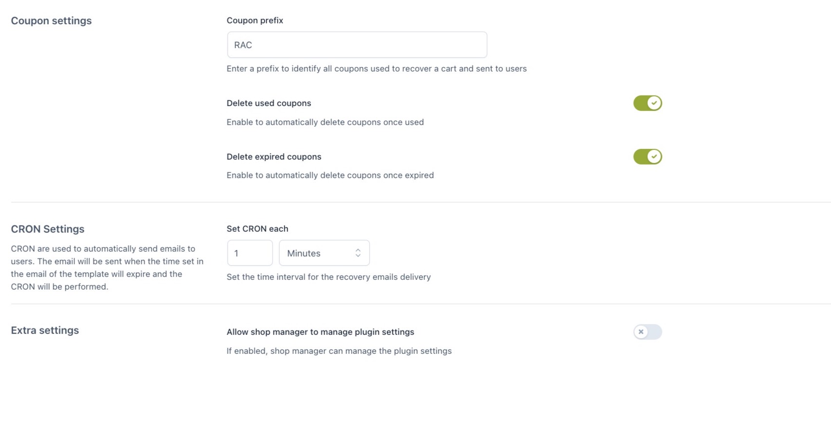 Il cuore del plugin è la configurazione degli automatismi: scegli dopo quanti minuti considerare un carrello come “abbandonato” e programma l’invio automatico dell’email di recupero dopo uno specifico lasso di tempo (un’ora, 24 ore, tre giorni, ecc.). Una volta definite queste regole il plugin lavorerà silenziosamente e costantemente per recuperare carrelli che altrimenti sarebbero irrimediabilmente persi.