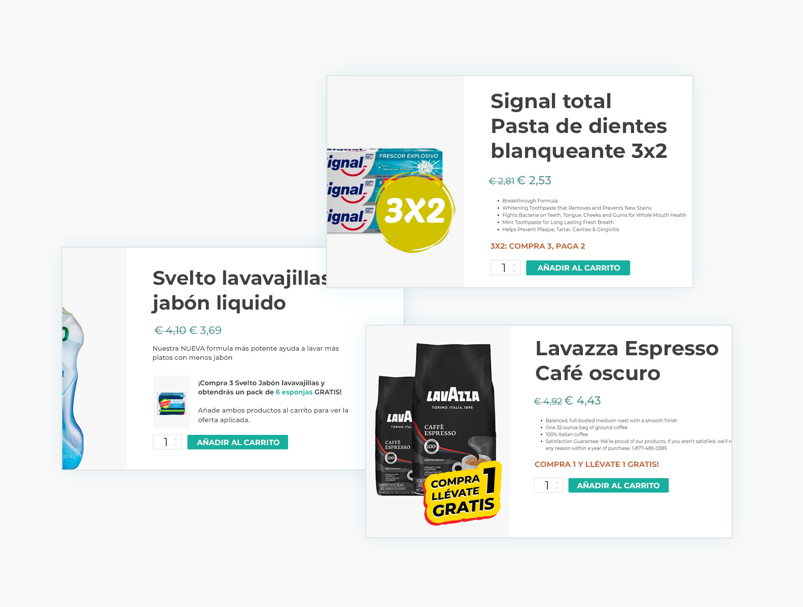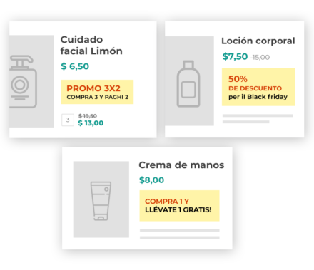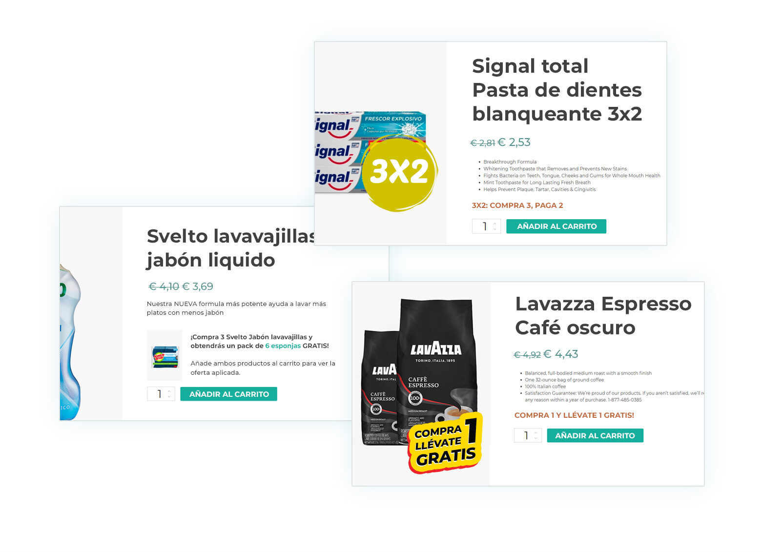 Crear cualquier tipo de descuento o promoción: 3×2, 2×1, compra 2 y paga 1, 50% menos en el segundo artículo, compra un producto y recibe otro de regalo, etc