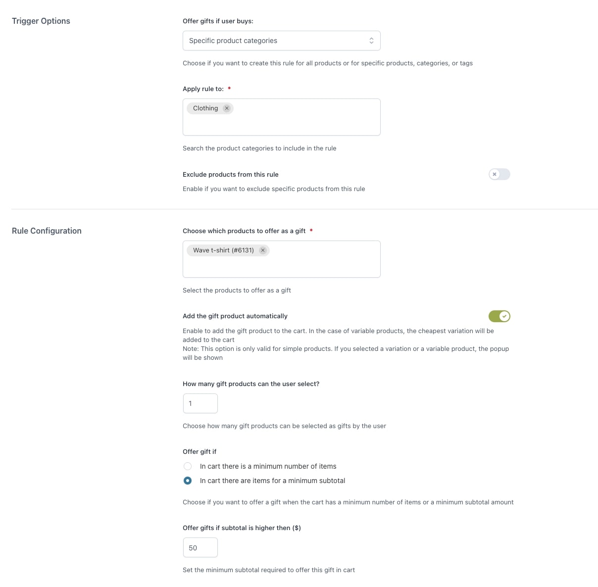 Un producto gratuito o un “regalo» son un gran incentivo para convencer a tus usuarios de completar la compra. Utiliza la opción “producto gratuito» y elige cuántos y cuáles productos regalar, a quién y con qué condiciones (por ejemplo, usuarios que tienen un carrito con un valor mínimo de €100 o que tienen un producto específico en su carrito).