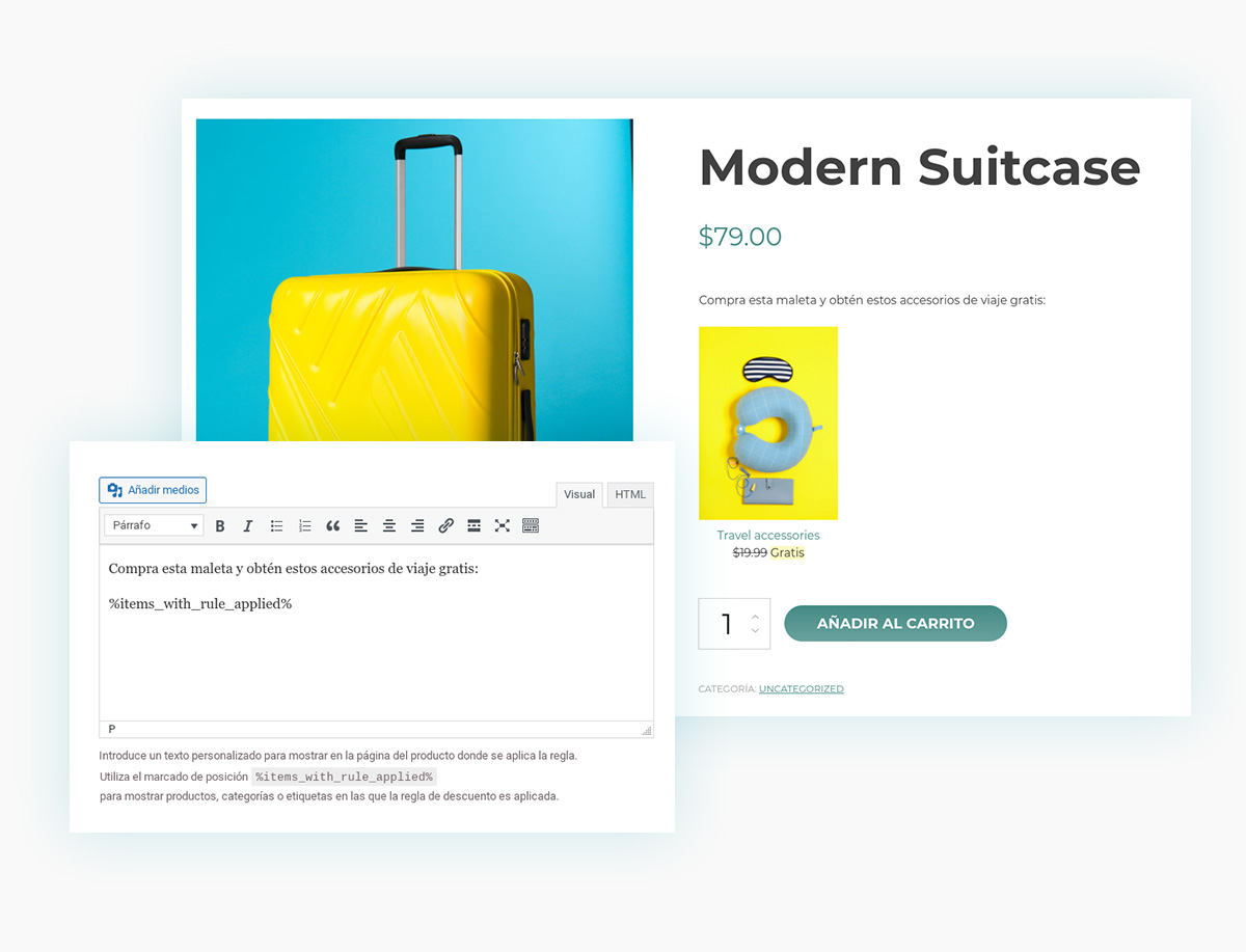 Utiliza el editor del plugin para configurar, programar y gestionar promociones y descuentos avanzados. Puedes elegir entre las más populares o crear promociones personalizadas según tus necesidades.