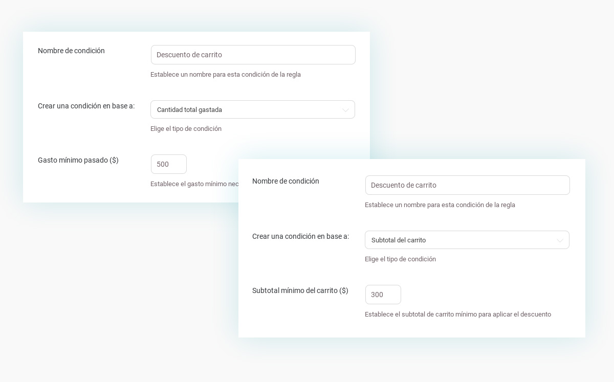Aplica cualquier regla avanzada de descuento al carrito de compras: puedes ofrecer 10% menos y envío gratuito solo si el total del para pedido que excede los €300 o si en el carrito hay cierta cantidad de productos; puedes crear descuentos solo para usuarios o roles de usuarios específicos, así como ofrecer un descuento a los clientes que hayan realizado cierta cantidad de pedidos en tu tienda o que hayan superado un límite de gasto determinado.