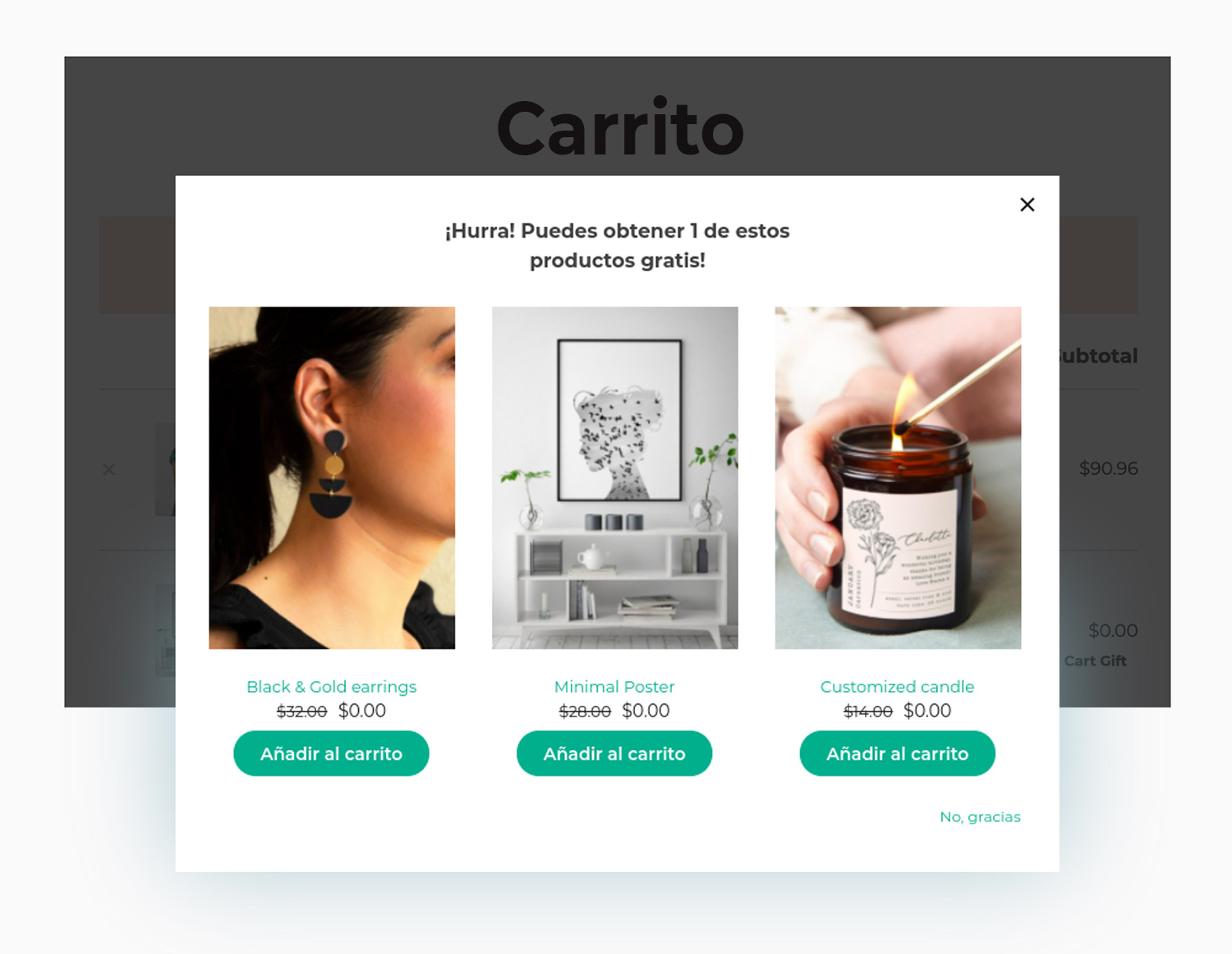 Mostrar una ventana modal en el carrito y ofrecer uno o más productos como regalo a los usuarios que gasten más de una cantidad establecida o que compren productos específicos