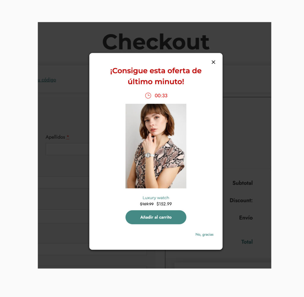 Aprovecha el principio de emergencia y promociona productos de venta dirigida antes de que el cliente complete su pedido, ya sea en la página del carrito o en la de pago. Puedes establecer un tiempo limitado para la oferta y mostrar una cuenta atrás dinámica para empujar a los usuarios a comprar inmediatamente.