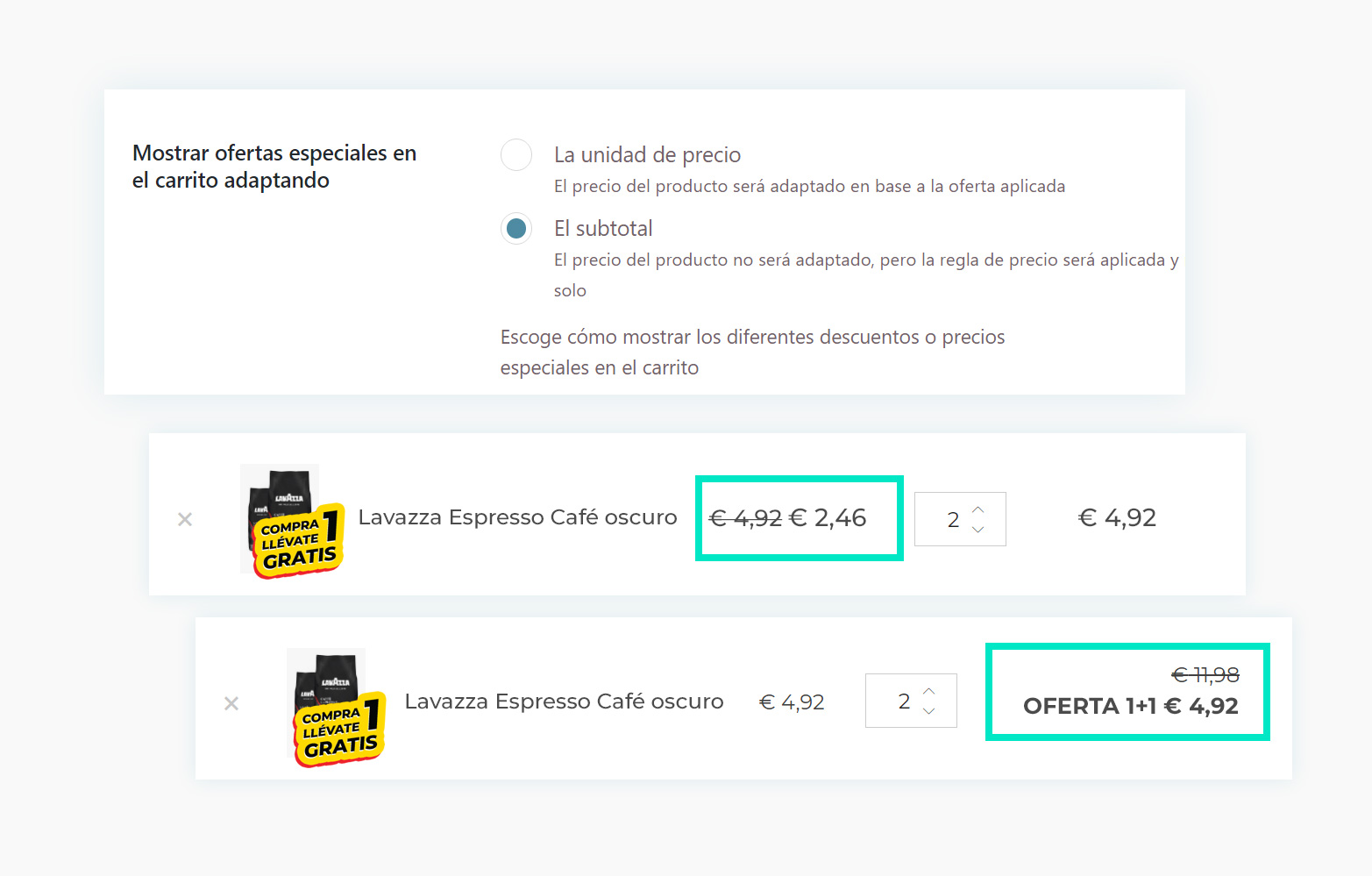 Una vez en el carrito, elige si los descuentos relacionados a un producto cambiarán el precio unitario del mismo o – nuevo a partir de la versión 2.0 – si solo se aplicará al total del carrito de compras.