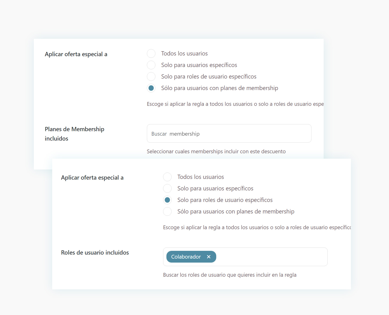 Puedes crear descuentos y promociones válidos para todos los usuarios o reservar ofertas solo para usuarios con roles específicos. En combinación con nuestro plugin de Membership, configura ofertas para miembros de un plan determinado. O aun mejor: crea descuentos en el carrito que solo se aplicarán a los clientes que hayan gastado cierta cantidad en tu tienda, o a aquellos que hayan realizado un mínimo de pedidos.