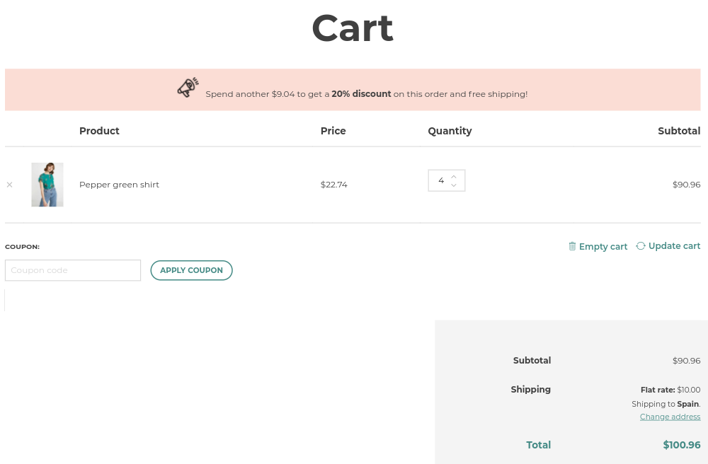 Ofrecer descuentos o envío gratis en función del total del carrito de compras es inútil si esta promoción no se anuncia. A partir de la versión 3.0, es posible mostrar mensajes dinámicos para las reglas de descuento aplicadas en el carrito de compras. Esto motivará a los usuarios a añadir más productos al mismo con el fin de aprovechar la promoción y/o del envío gratis. Es una buena práctica usada por las grandes empresas y que no puede faltar en la tuya, si quieres aplicar descuentos y promociones en la página del carrito y mejorar la experiencia del usuario.