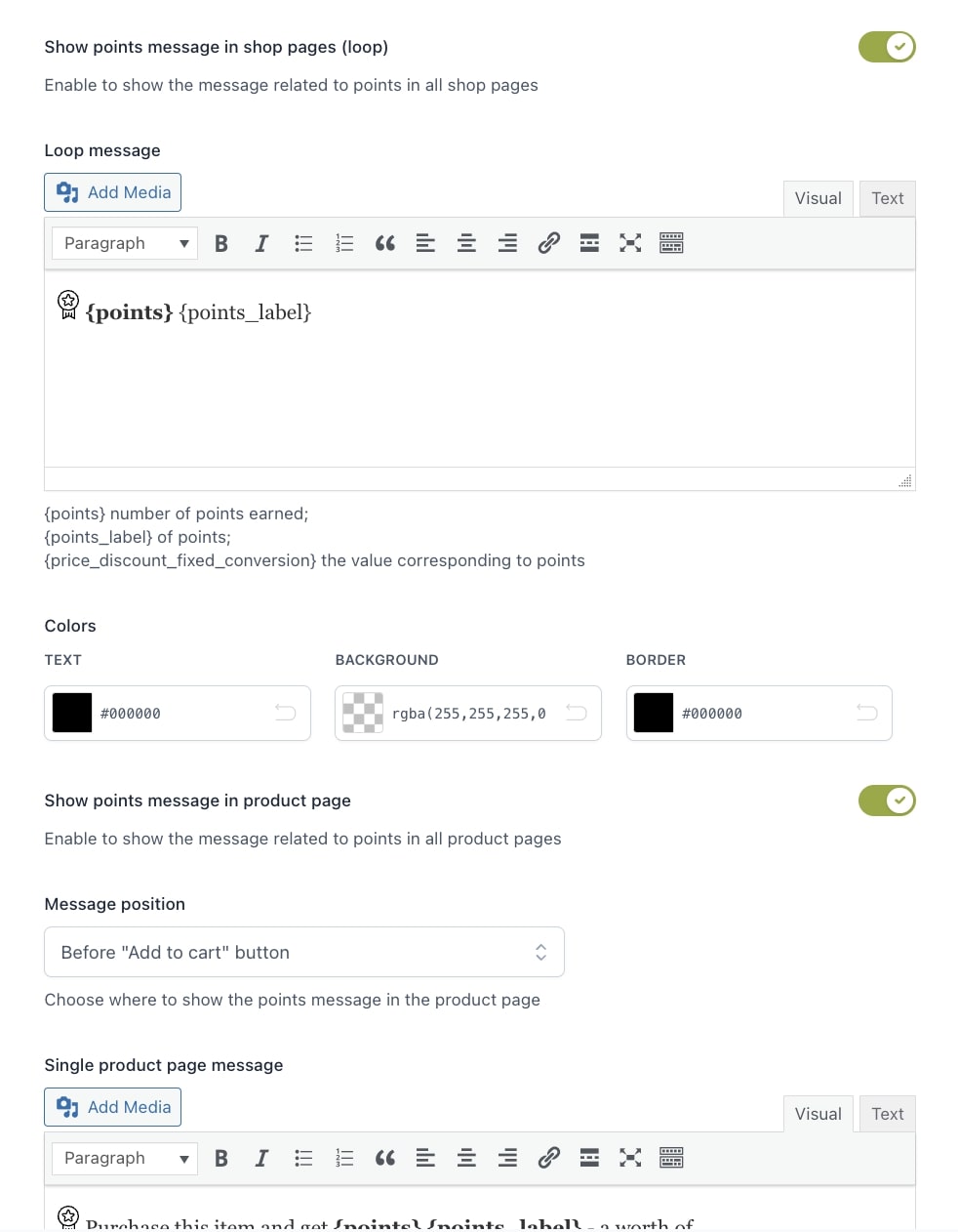 Inserta un texto personalizado, carga un icono o una imagen, cambia el texto y los colores de fondo para mejorar el mensaje que se muestra a los usuarios relacionado con los puntos que ganarán con la compra del producto.