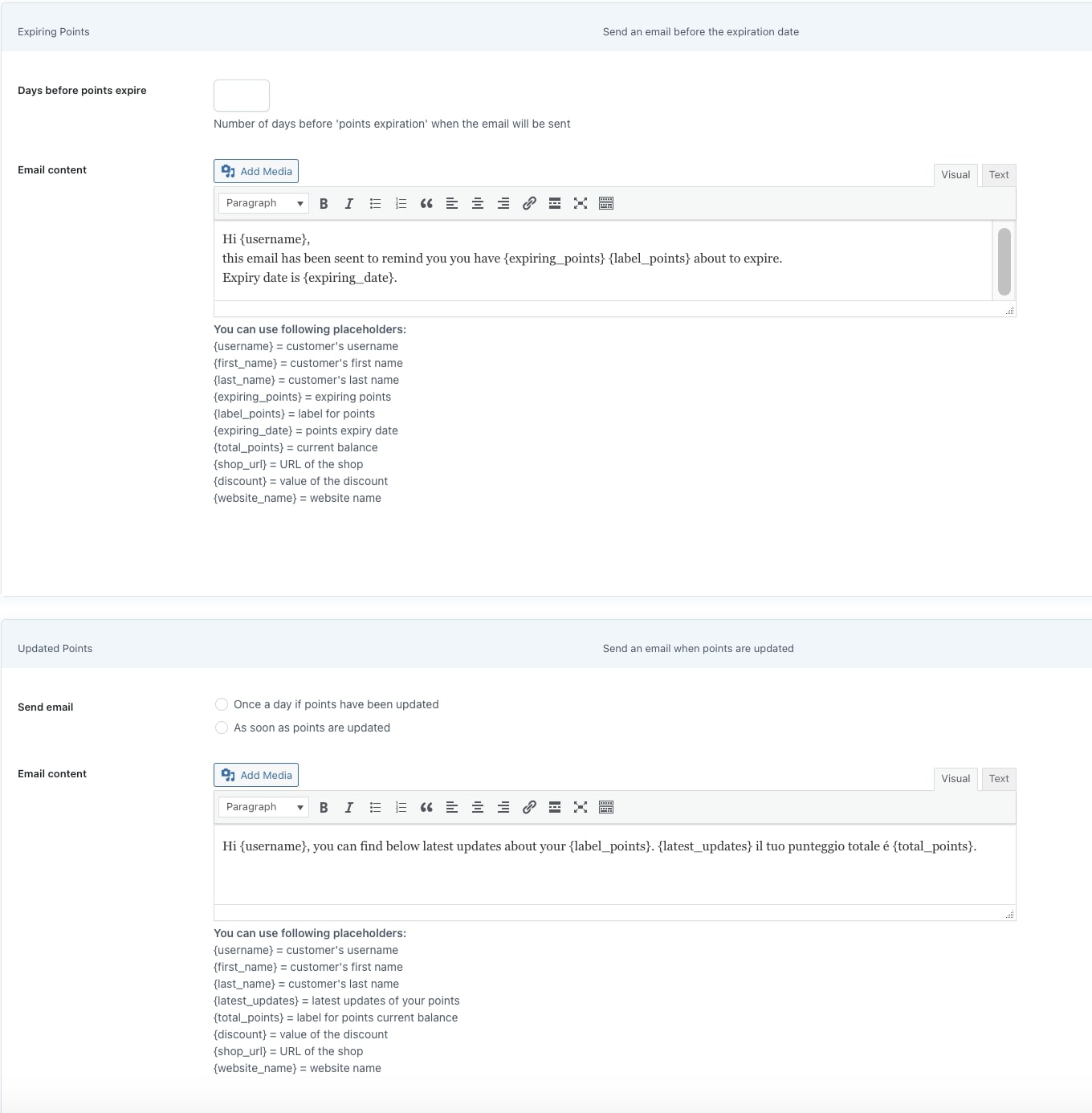 El plugin permite enviar un correo electrónico automático para informar a los usuarios de que sus puntos están a punto de caducar. Puedes especificar el número de días antes de la expiración para enviar el correo electrónico.
