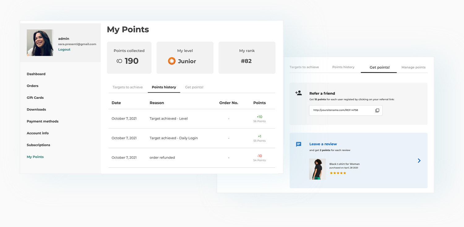 • Habilita un sistema de referencia asignando puntos a los usuarios que comparten un enlace de referencia. Podrán obtener puntos por cada nuevo cliente registrado a través de su enlace de referencia y también por cada compra realizada a través del mismo.