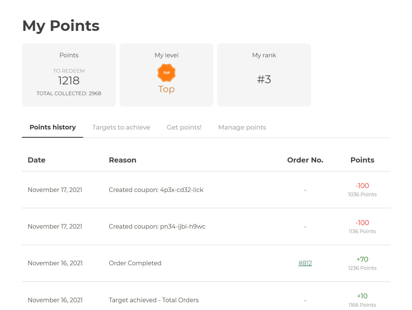 Los usuarios pueden seguir fácilmente los puntos obtenidos, pedidos realizados y las acciones relacionadas con sus puntos desde su cuenta personal.En la página Mi cuenta también puedes mostrar banners personalizados para incentivar a los usuarios a acumular más puntos dejando opiniones, completando su perfil, recomendando a un amigo, etc.