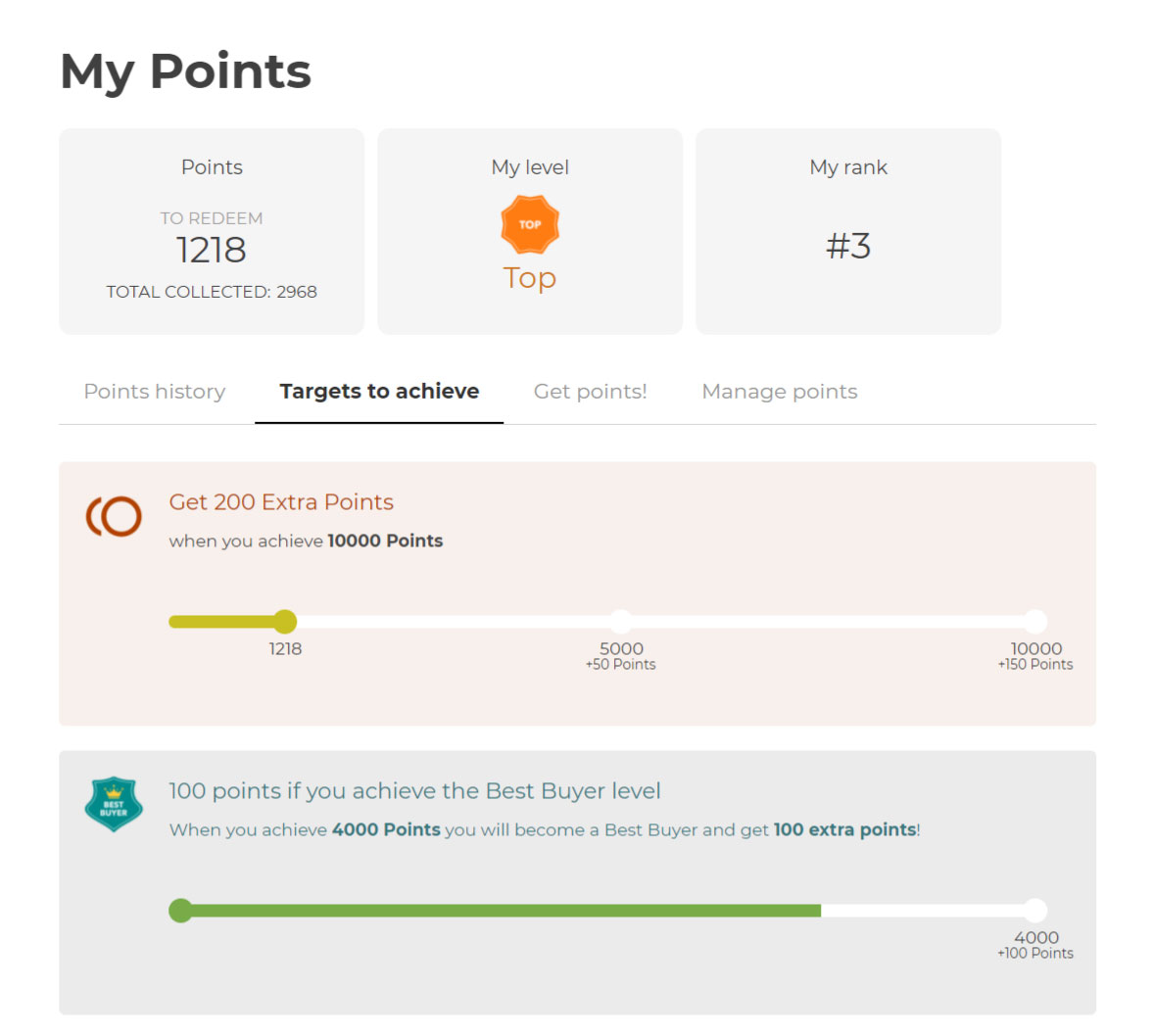 Recompensa a tus usuarios asignándoles puntos extra al alcanzar un objetivo (por ejemplo, puntos extra tras realizar 100 pedidos, tras gastar una cantidad total de 1000 euros, al ganar 500 puntos) al alcanzar un determinado nivel o la posición nº 1 de la clasificación, etc.) o en condiciones específicas (por ejemplo, 10 puntos en su cumpleaños, 5 puntos por cada reseña publicada, 30 puntos por cada nuevo usuario registrado a través de un enlace de recomendación, etc.).