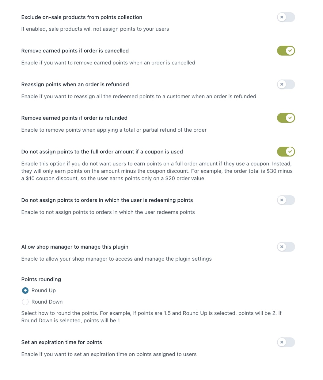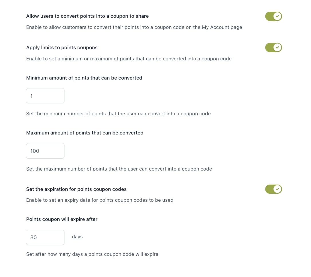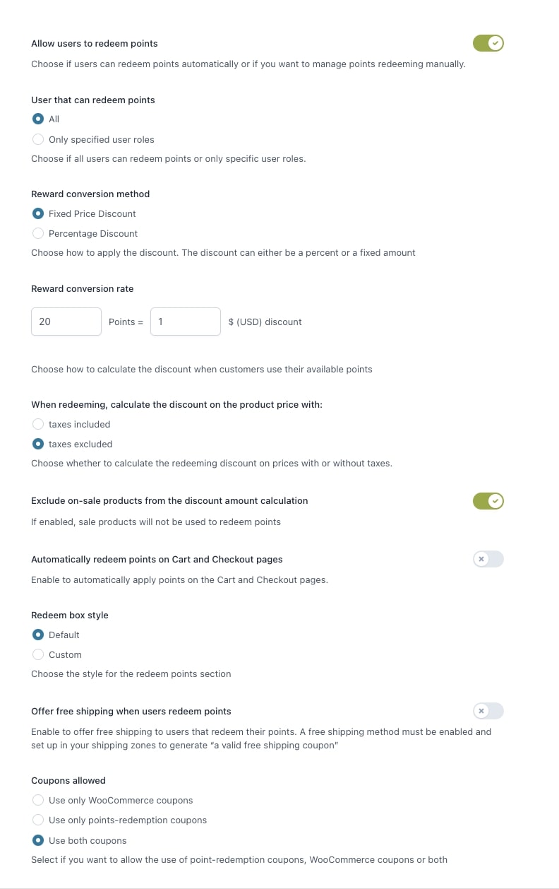 En función de tus necesidades, puedes establecer condiciones para que los usuarios puedan canjear los puntos: por ejemplo, puedes establecer un importe mínimo del carrito, un descuento máximo en el producto individual o en el carrito al comprar con un cupón.