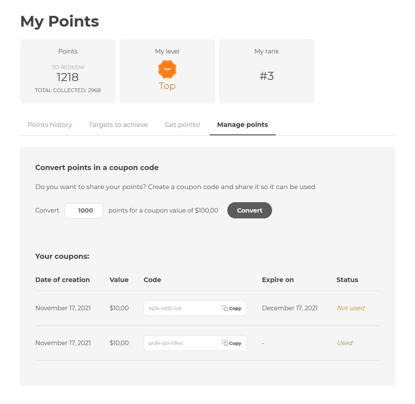 Los puntos se canjean automáticamente a través de un cupón de descuento aplicado al carrito del usuario. Fácil de establecer y gestionar, nuestro plugin es la solución definitiva para construir un potente programa de fidelización para tus clientes en pocos minutos.