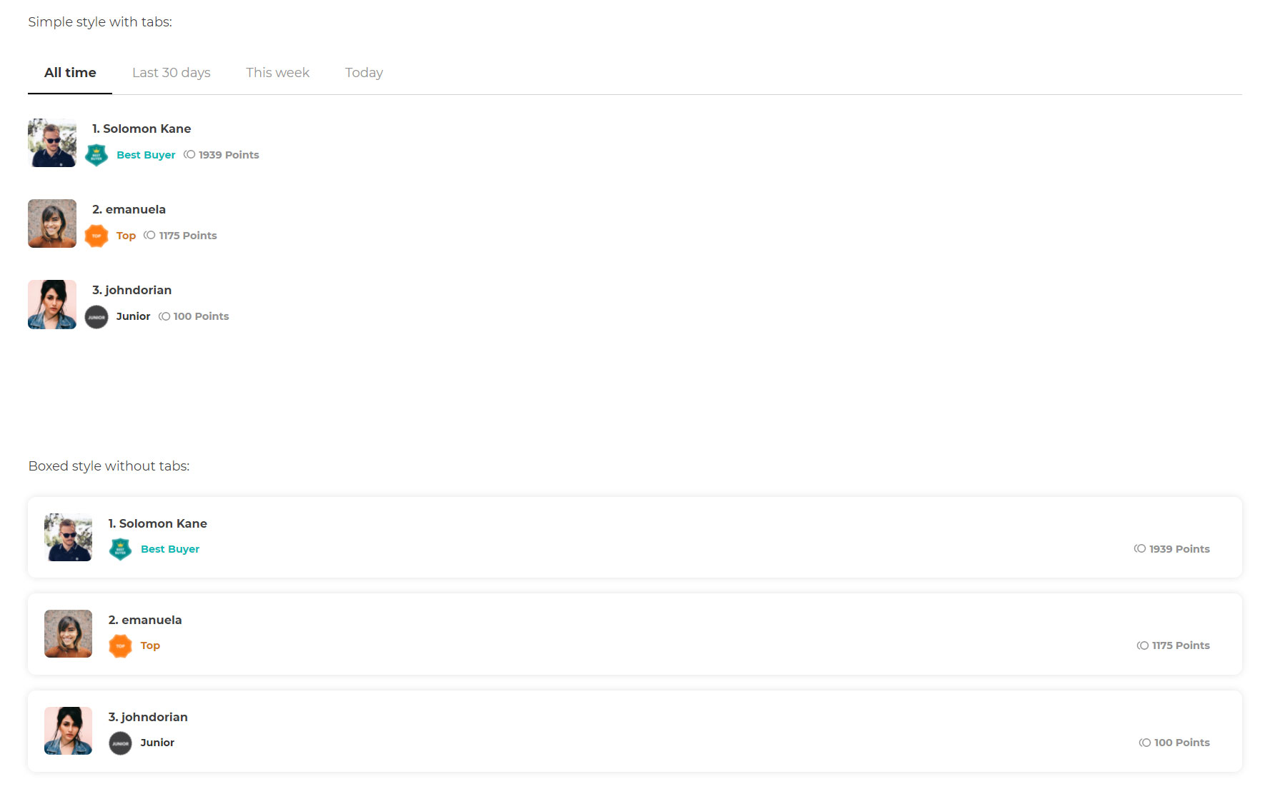 Sí, desde la versión 3.0 puedes ver una clasificación que muestra los clientes que han ganado más puntos. La lista puede mostrar el total de puntos de siempre o filtrar por los últimos 30 días, esta semana o hoy.