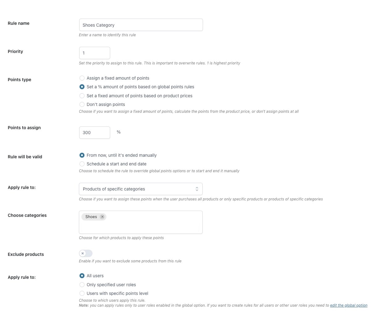 Cree una regla global para definir el número de puntos que se asignará en función del valor del producto y, si es necesario, asigne un número diferente a productos o categorías específicas (por ejemplo, puede asignar un mayor número de puntos sólo en la compra del producto X y ningún punto a los productos pertenecientes a la categoría Y).
