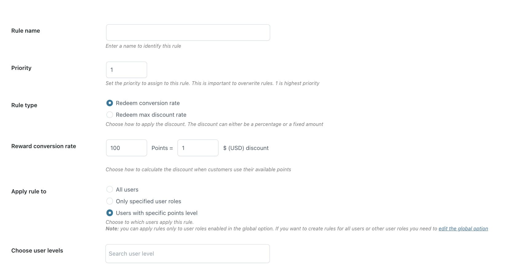 Establece diferentes tasas de conversión para usuarios específicos, roles de usuario, miembros o usuarios que alcanzan un «nivel» específico