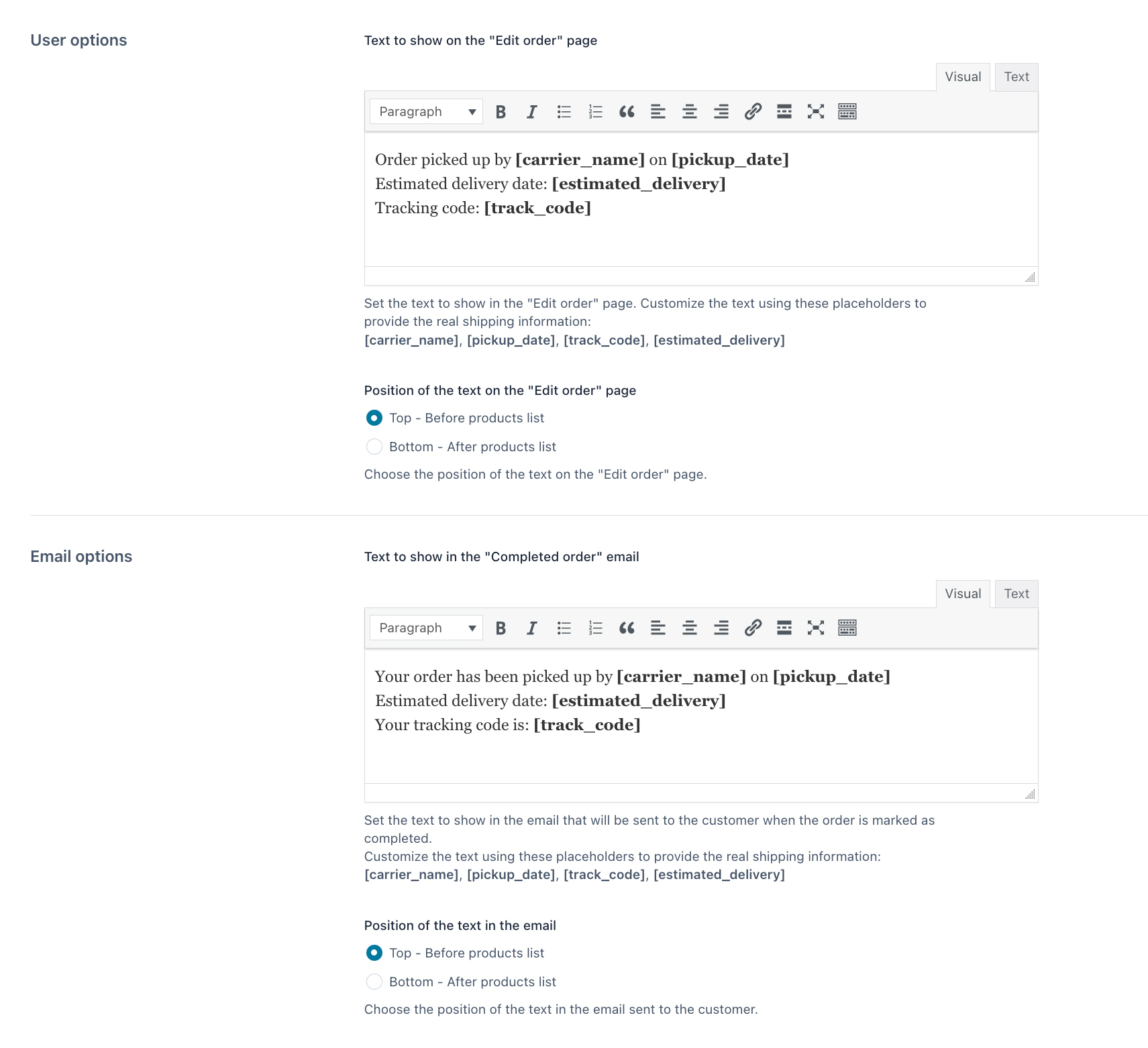 Choose the position of the tracking info text in the email (above or below the products table)