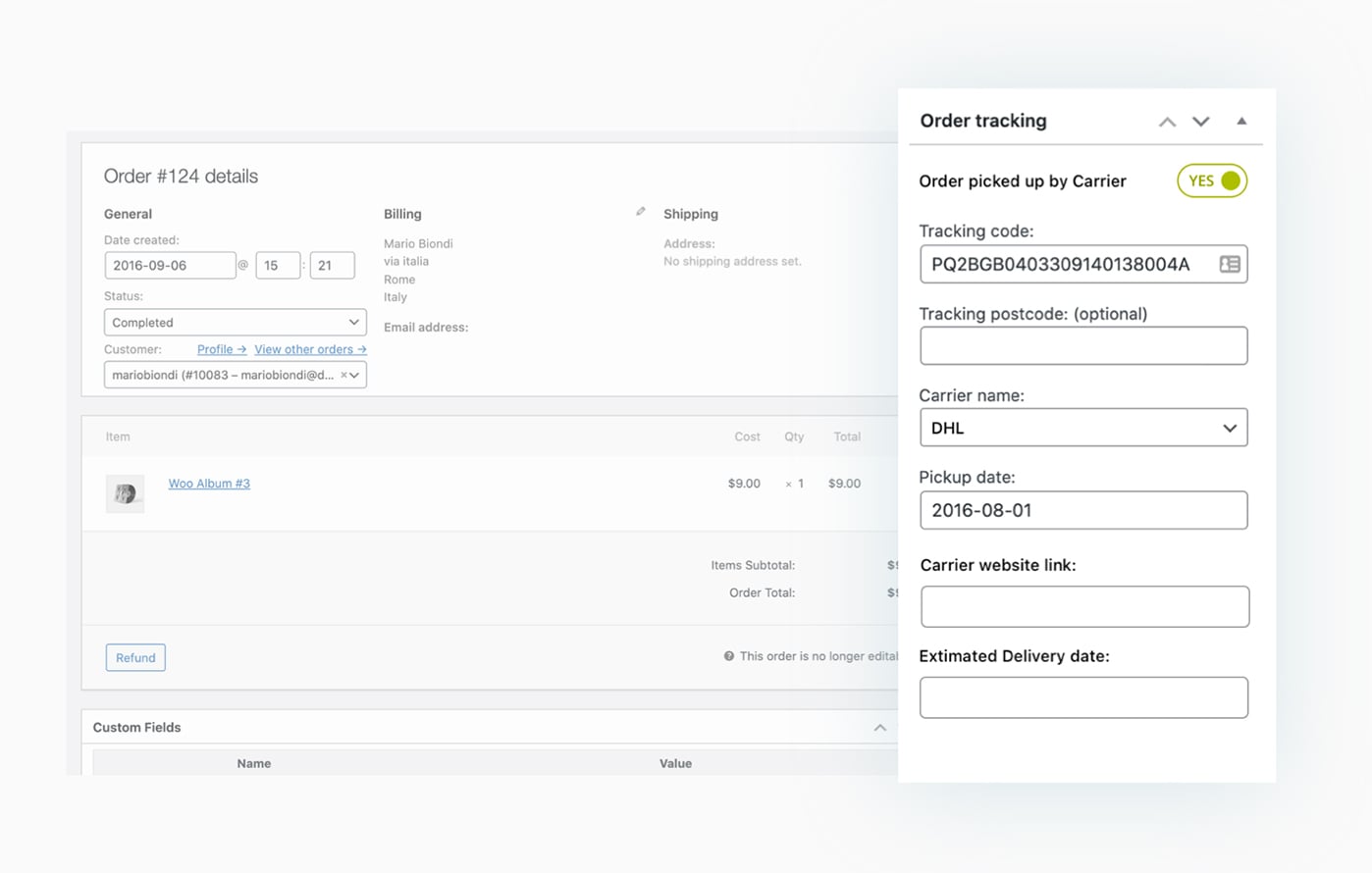 The plugin is very easy to use. Once installed, you just need to open the order and insert the tracking data in the related panel. You can also import tracking data through a CSV file.