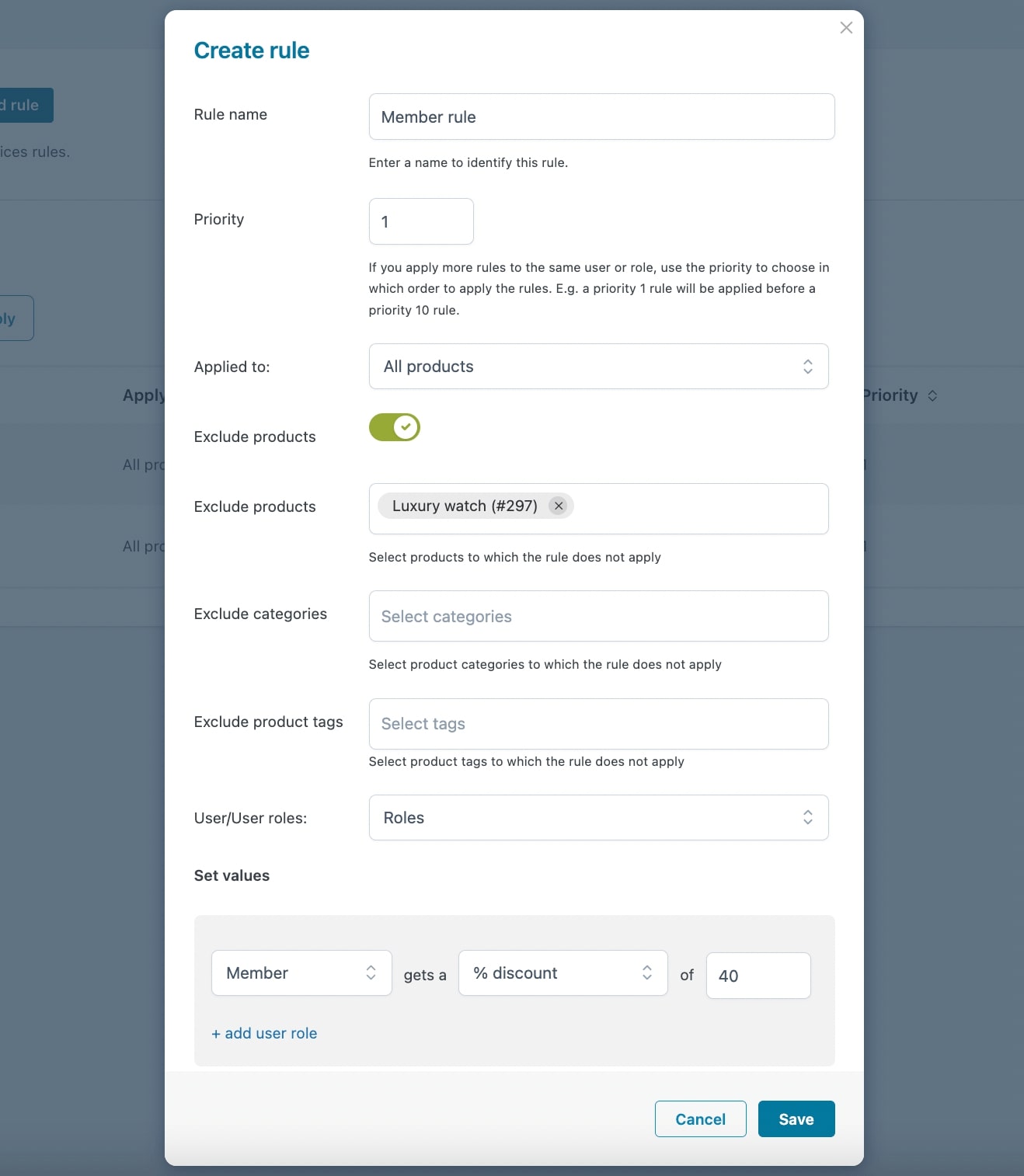Through the Price rules panel, you can quickly (and with just two clicks!) create rules that apply to all of your products. For example, you can create a single global rule to apply a 10% discount to all the products in the “Technology” category for the “partner” user role or a 15% discount on the entire product catalog for the “reseller” role. You can also override these global rules for specific products for even more versatility.