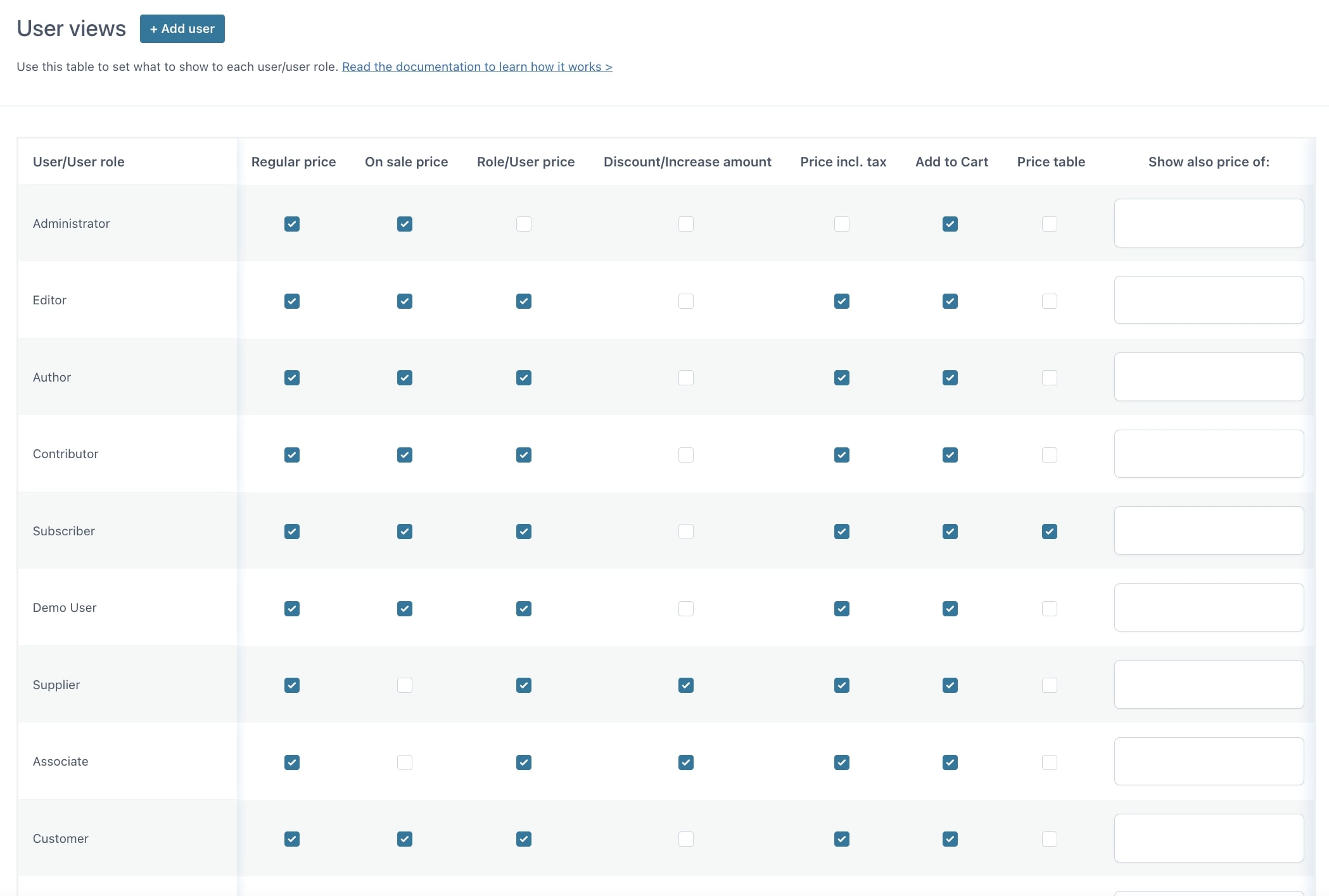 You can also easily hide prices and “Add to cart” buttons for specific user roles using the dedicated table. This allows you to enable a “catalog feature” in your shop so that, for example, only users with the “partner” or “reseller” role can see prices and purchase the products you sell.