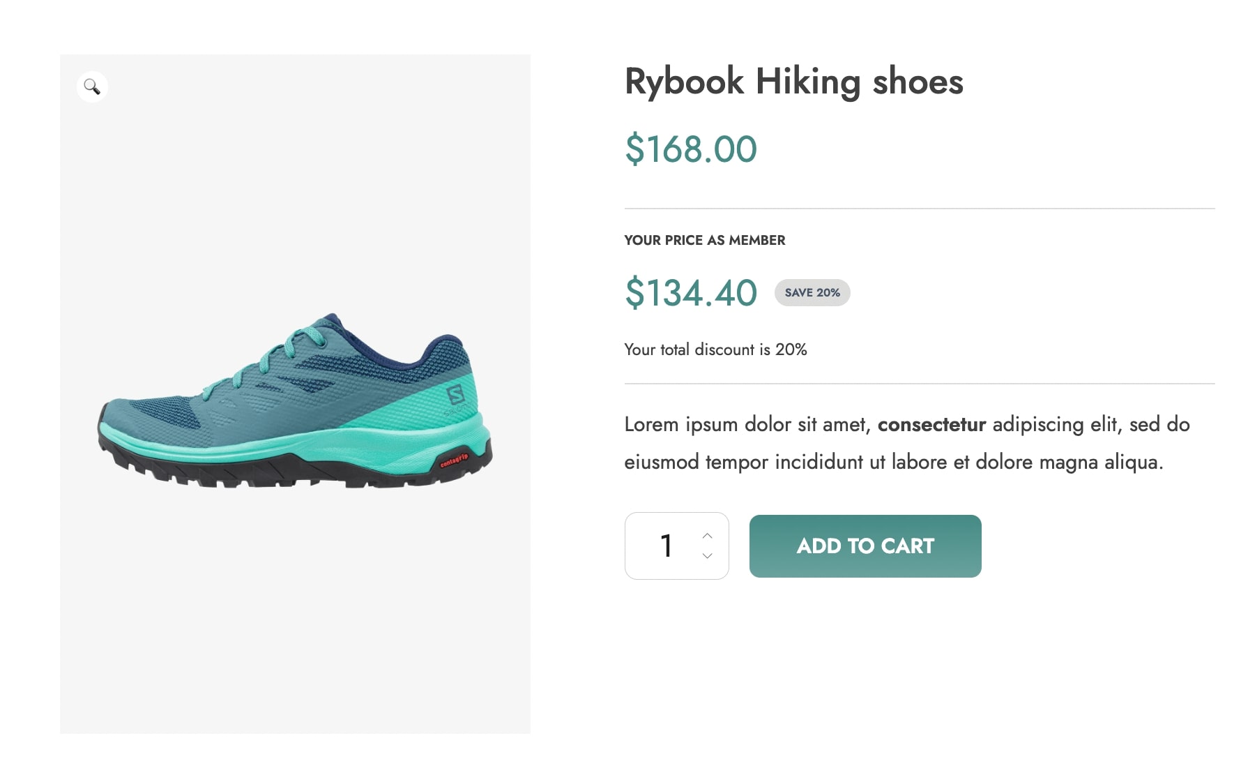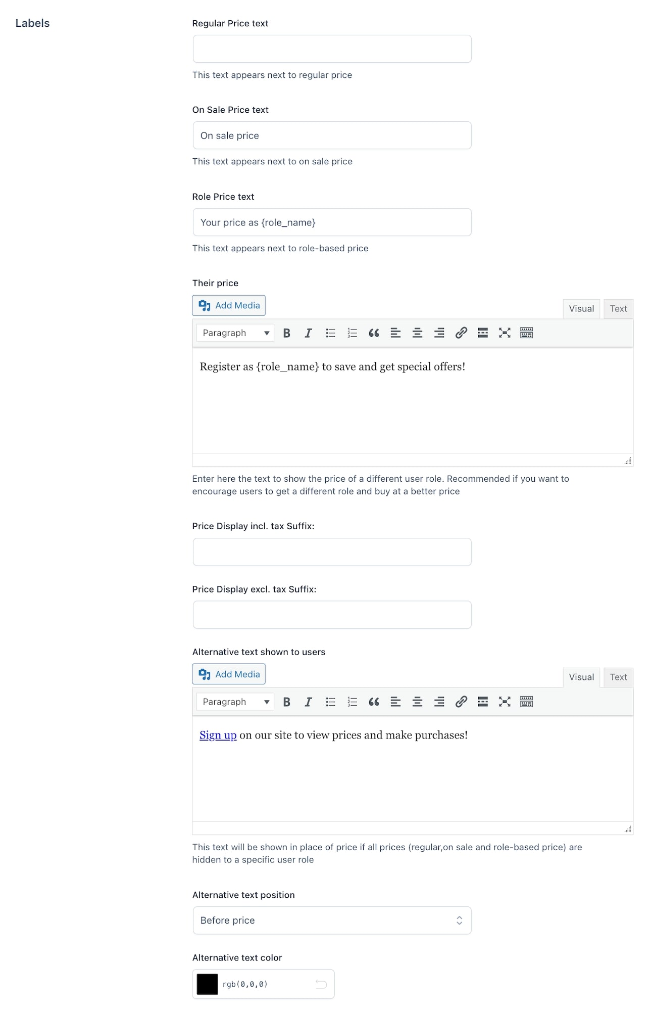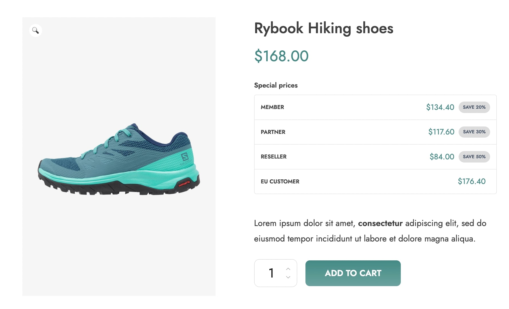 For each user role, you can decide which price to show (the regular price, the discounted one, or the one based on the user role) and add customized messages to encourage customers to register as partners, become resellers, or sign up as members to take advantage of ad hoc pricing discounts.