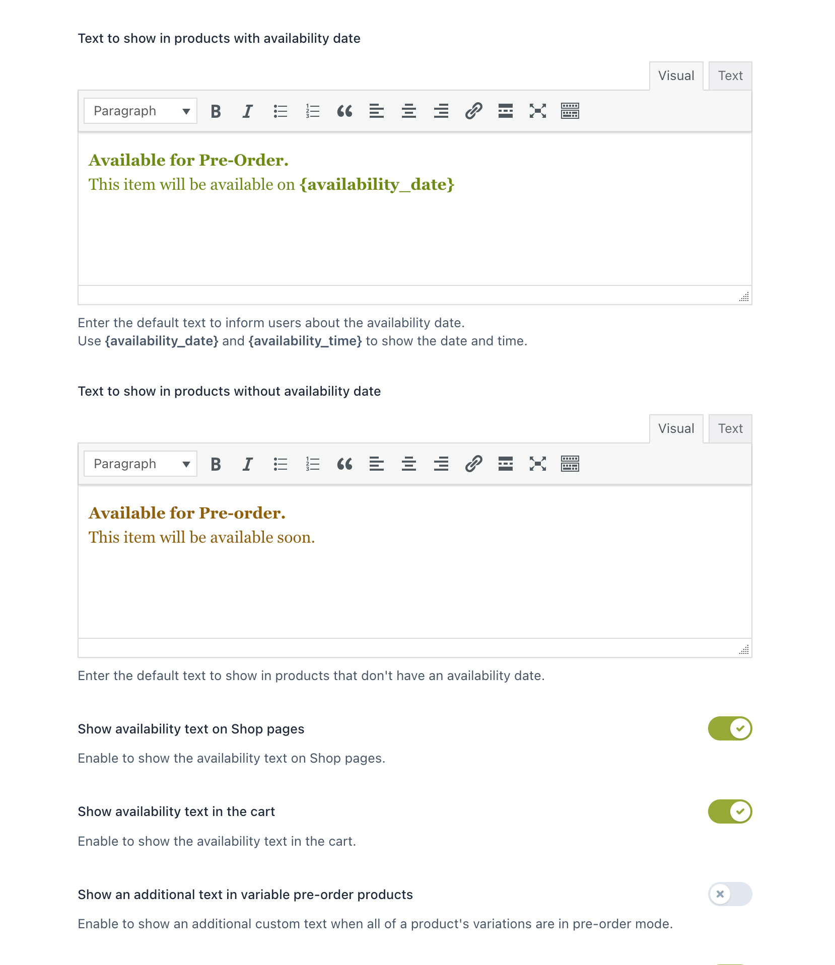 Replace the standard “Add to cart” button with a “Pre-order” button, customize the label and the colors, and set a custom message (to show in product detail pages and in shop pages) to inform your customers about the availability date. The plugin includes many options to customize the way your shop looks to the customers.