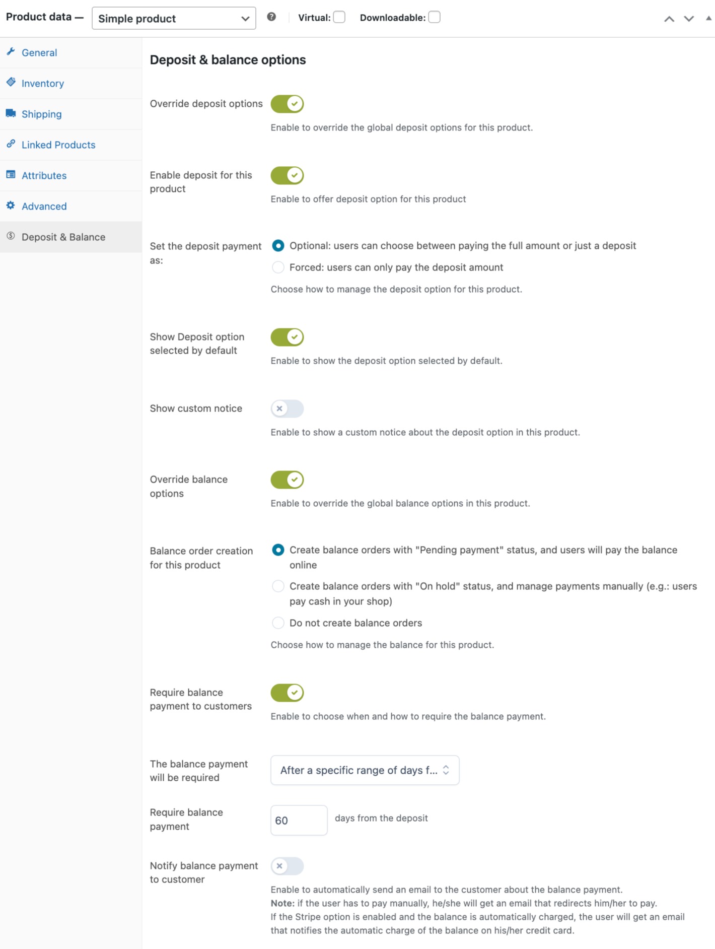 You can enable the deposit feature on the entire shop by using the global options or allow the deposit to be paid only for specific products or categories. You can also set ad hoc options for product variations.