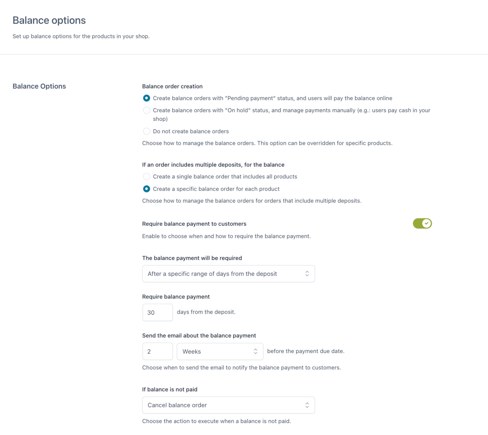 Through the option Require balance payment to customers, you can decide the action to execute in case customers won't complete the payment for the balance orders. You can find details about this option here.