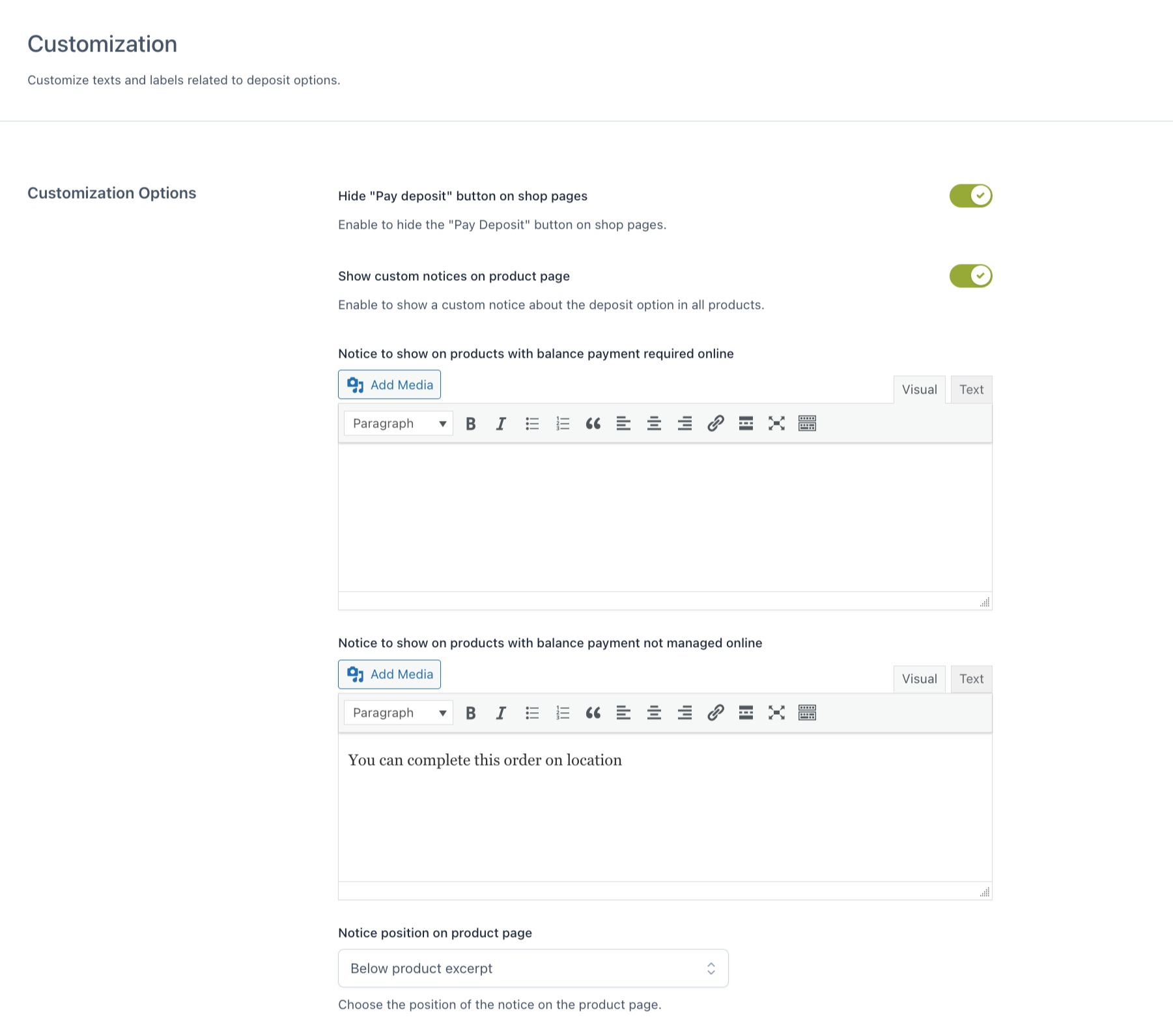 Allow your customers to choose whether to pay for the whole amount or just the deposit first, or make the deposit mandatory on your products.