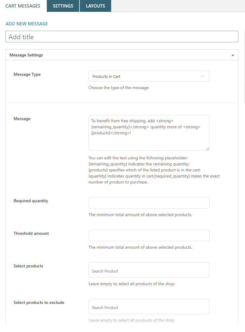 The plugin allows creating custom messages to show in the product, Shop, Cart and Checkout pages.