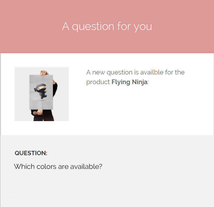 You can receive a notification email for each new question about your products, in addition to notifying the users who have previously written a question for that particular product.