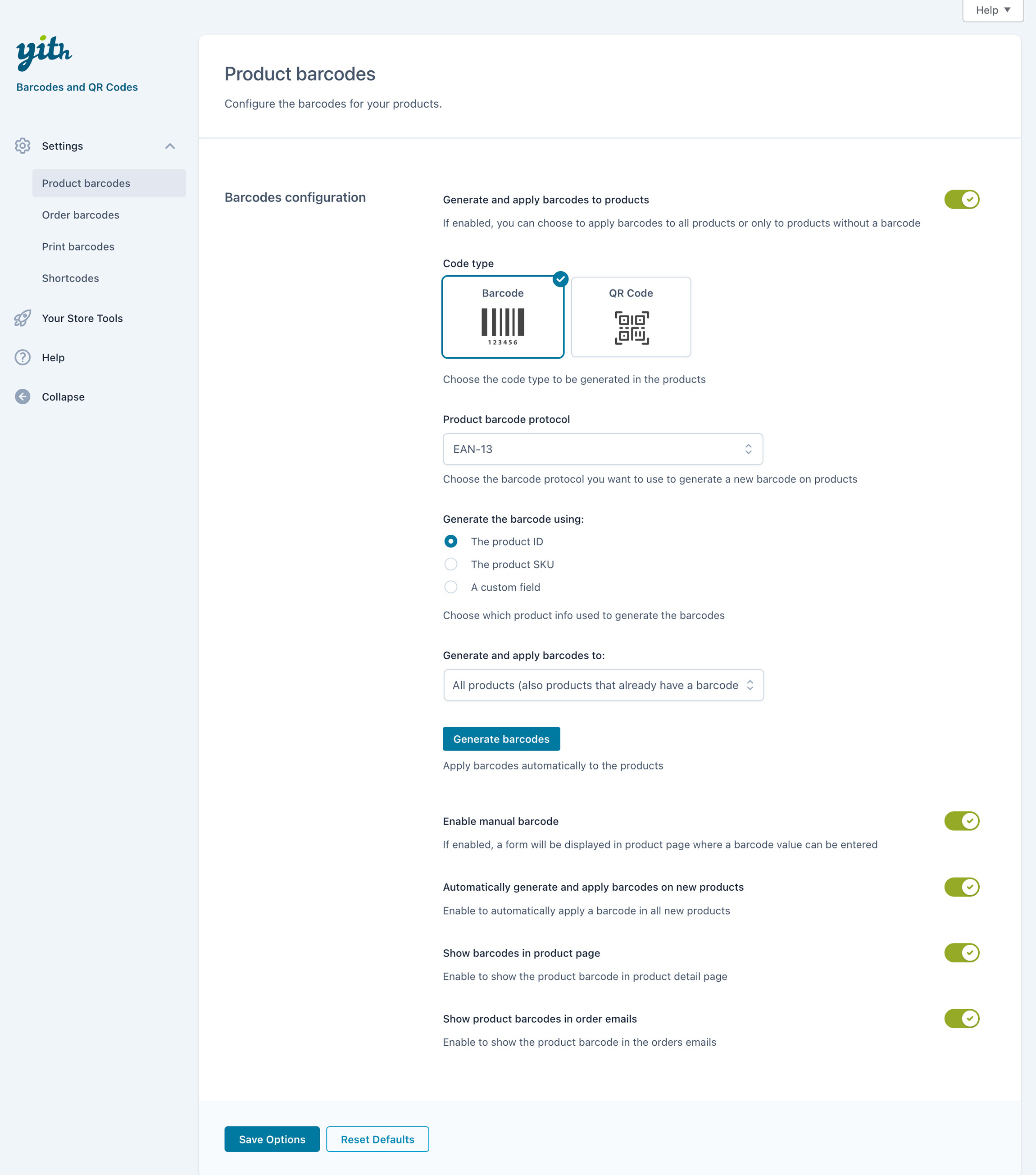• Choose whether to generate the product barcode or QR code from the product ID, the SKU, or a custom field
