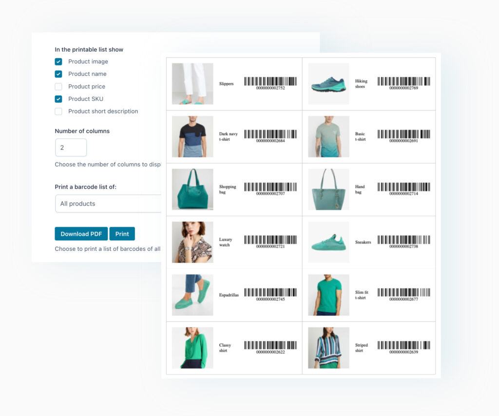 • Print all your products' barcodes/QR codes (product variations included) into a PDF file