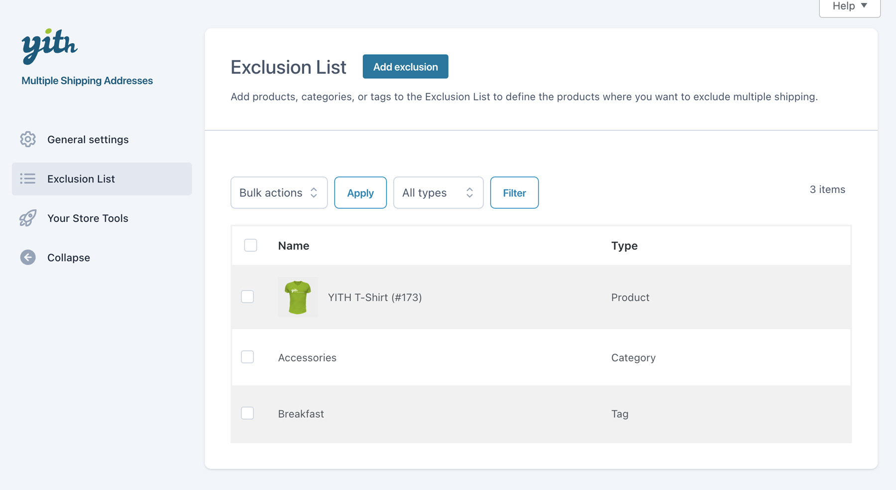Thanks to the exclusion list, you can select what products, categories, or specific tags you want to exclude from the multiple shipping options.