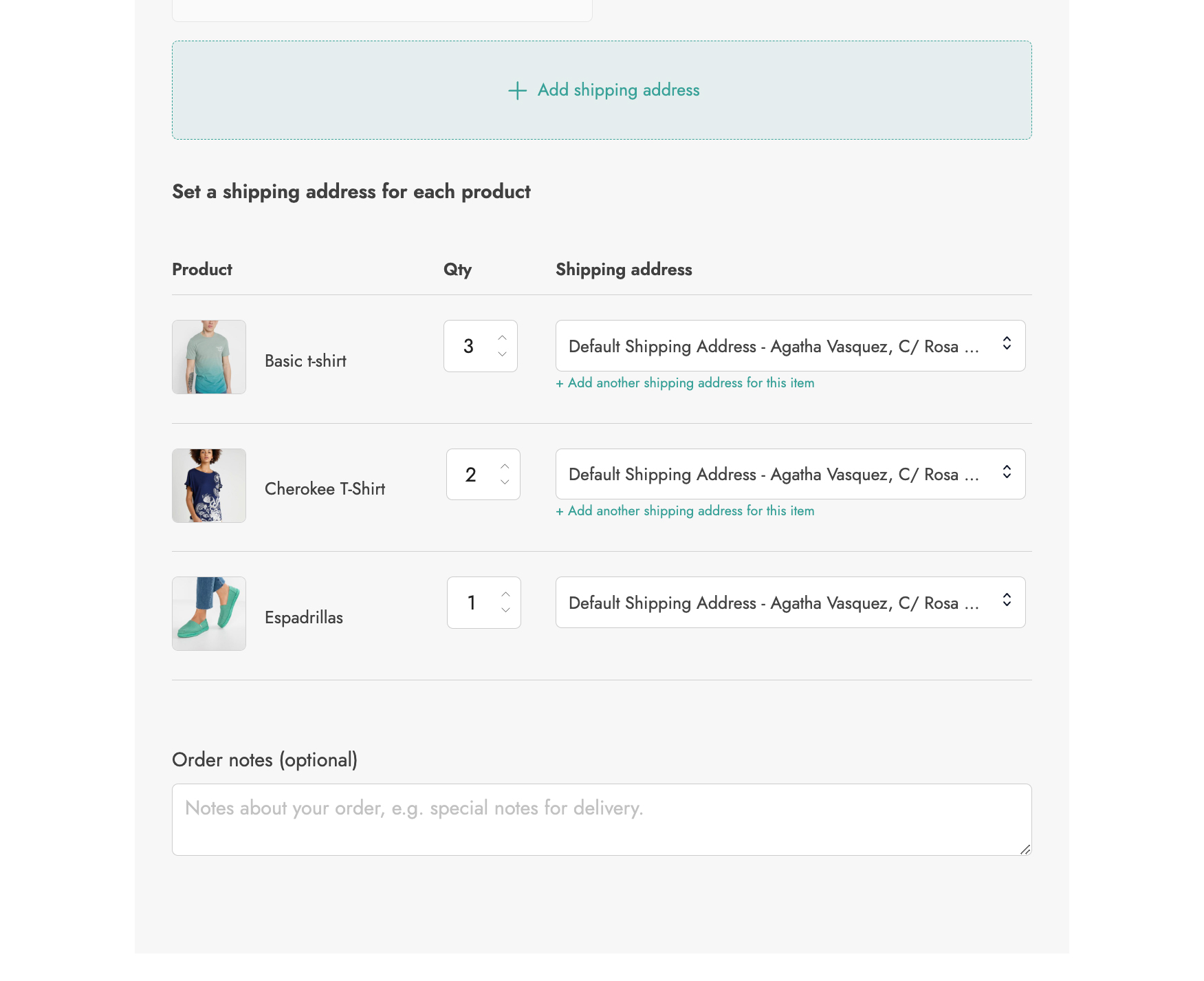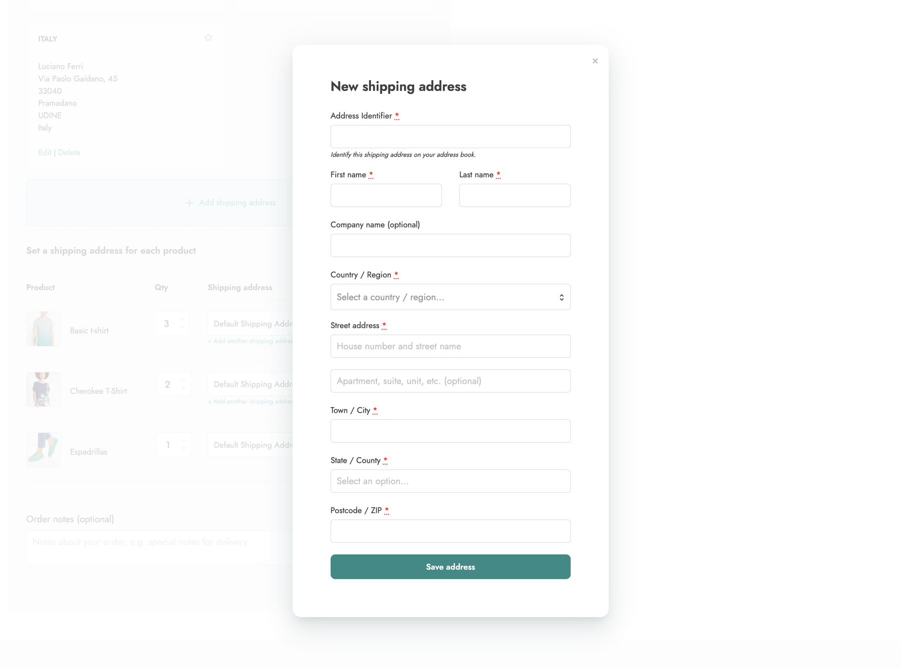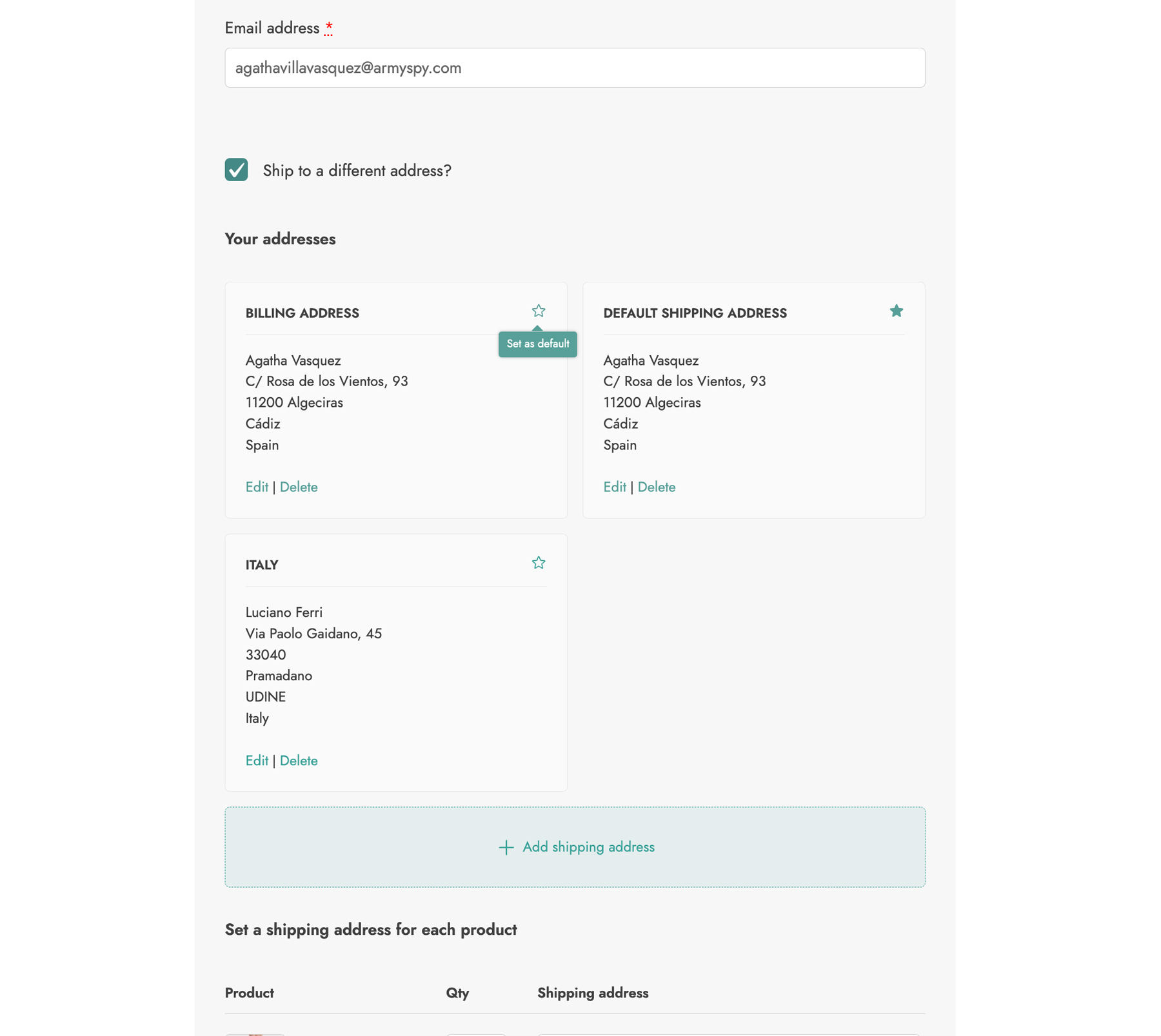 With just one click, the plugin opens a modal window that allows customers to add unlimited shipping addresses right on the Checkout page. They can either set an address as “default” and automatically apply it to all products or manually select a shipping address for each product in the order.