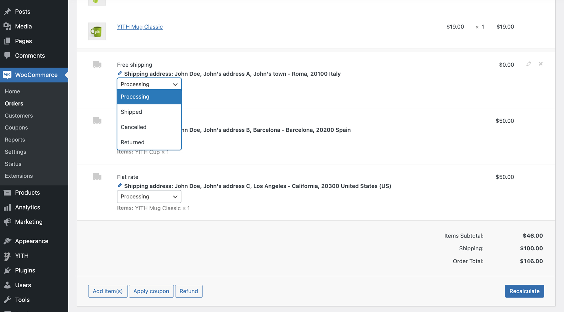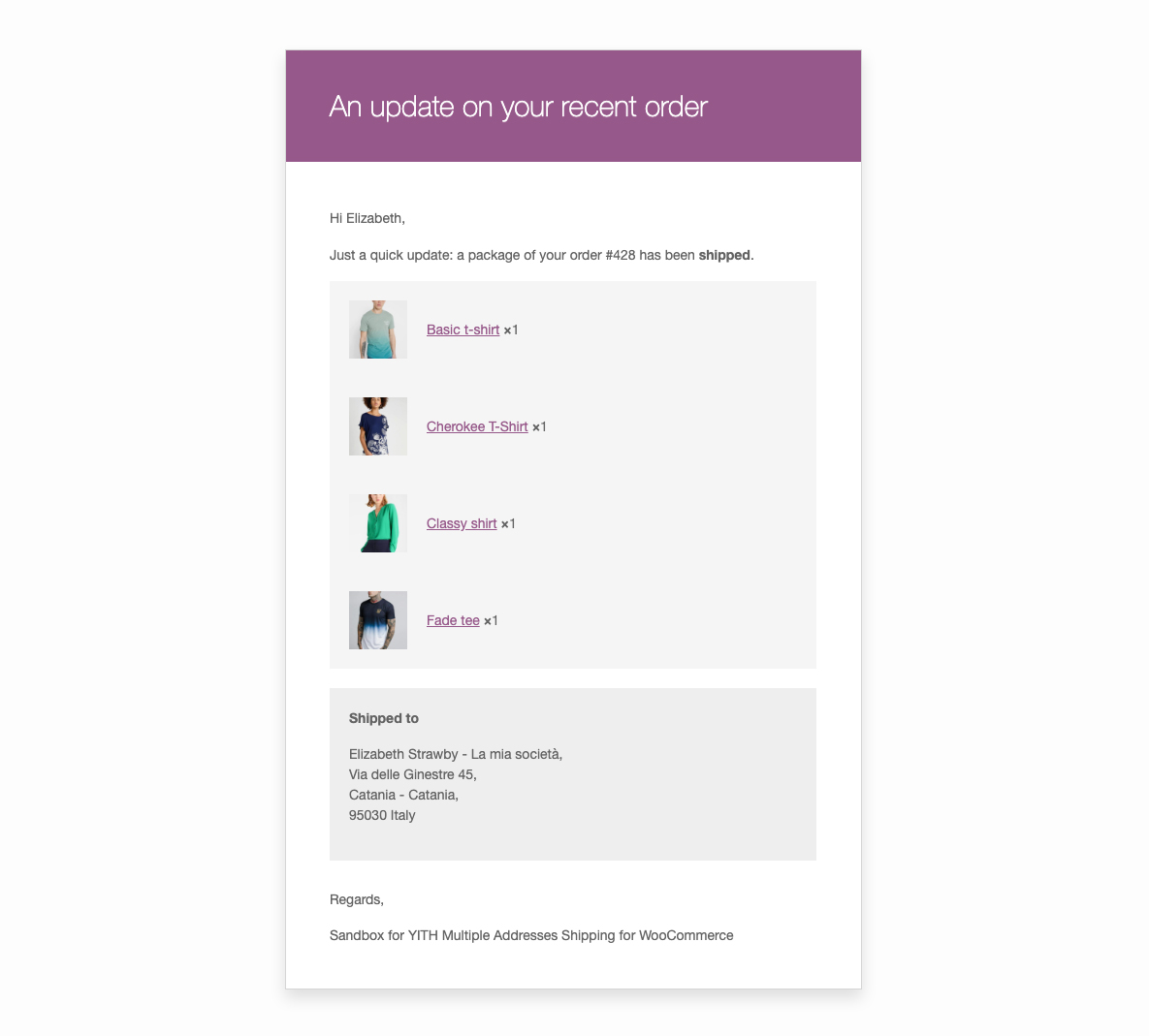 Thanks to a key feature in the plugin, customers can manage the number of products to be sent to each address with more flexibility. Here’s a real example from one of our customers: a user wanted to buy ten T-shirts for a bachelorette party and get one sent to herself, another three to her friends in Italy, and the remaining six to the venue where the party will be held in Spain. This was of course achieved very easily with the multiple shipping options added by this plugin.