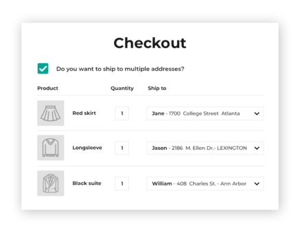 • Improve user experience and reduce cart abandonment by allowing customers to buy several products in a single order but send them to different addresses.