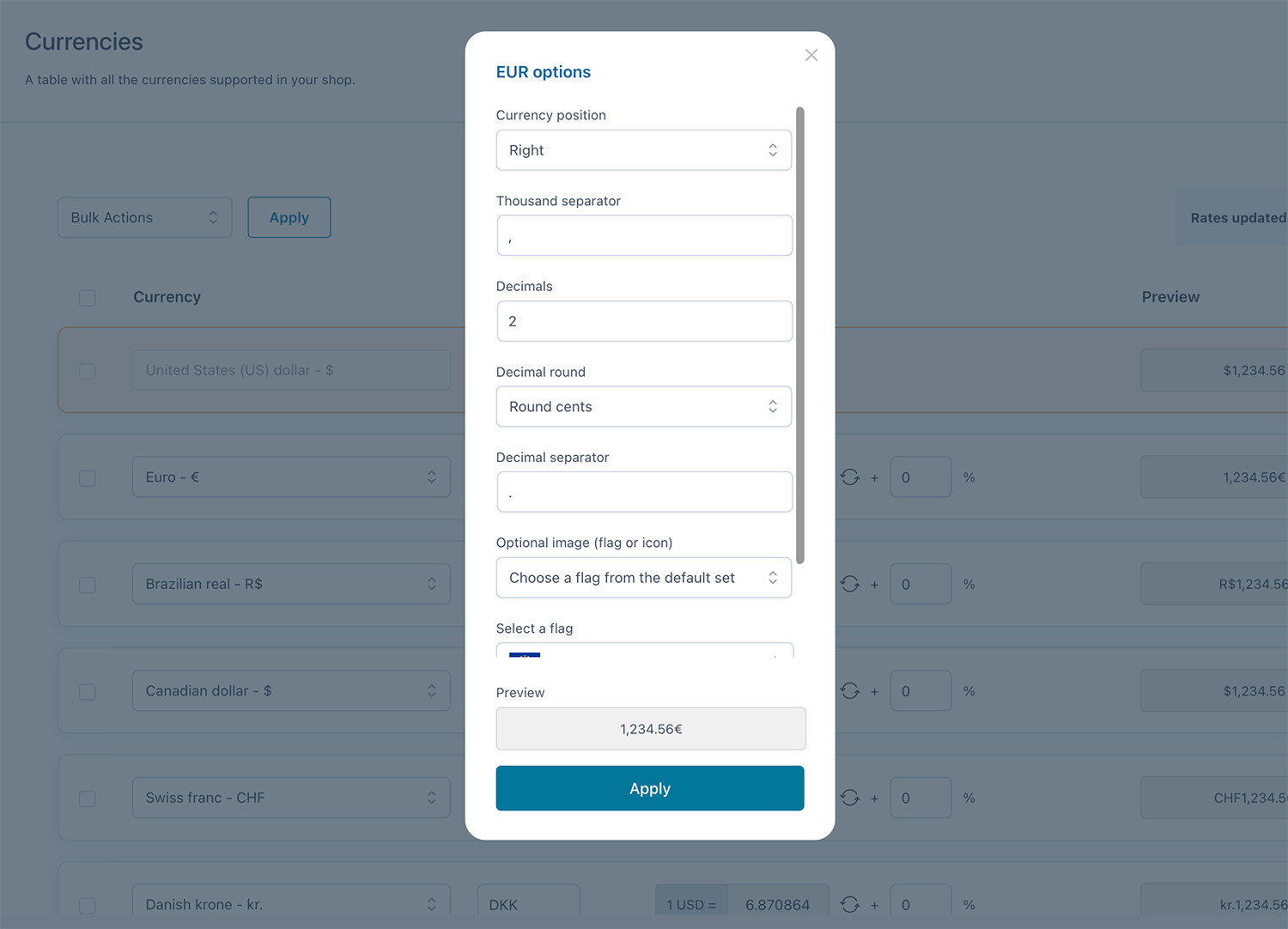 From the first plugin tab, you will be able to add as many currencies as you wish for your shop, easily and quickly. For each currency, you will be able to display the currency symbol or set up a custom text, upload an icon (like the flag) or set the number of decimals to show, and much more.