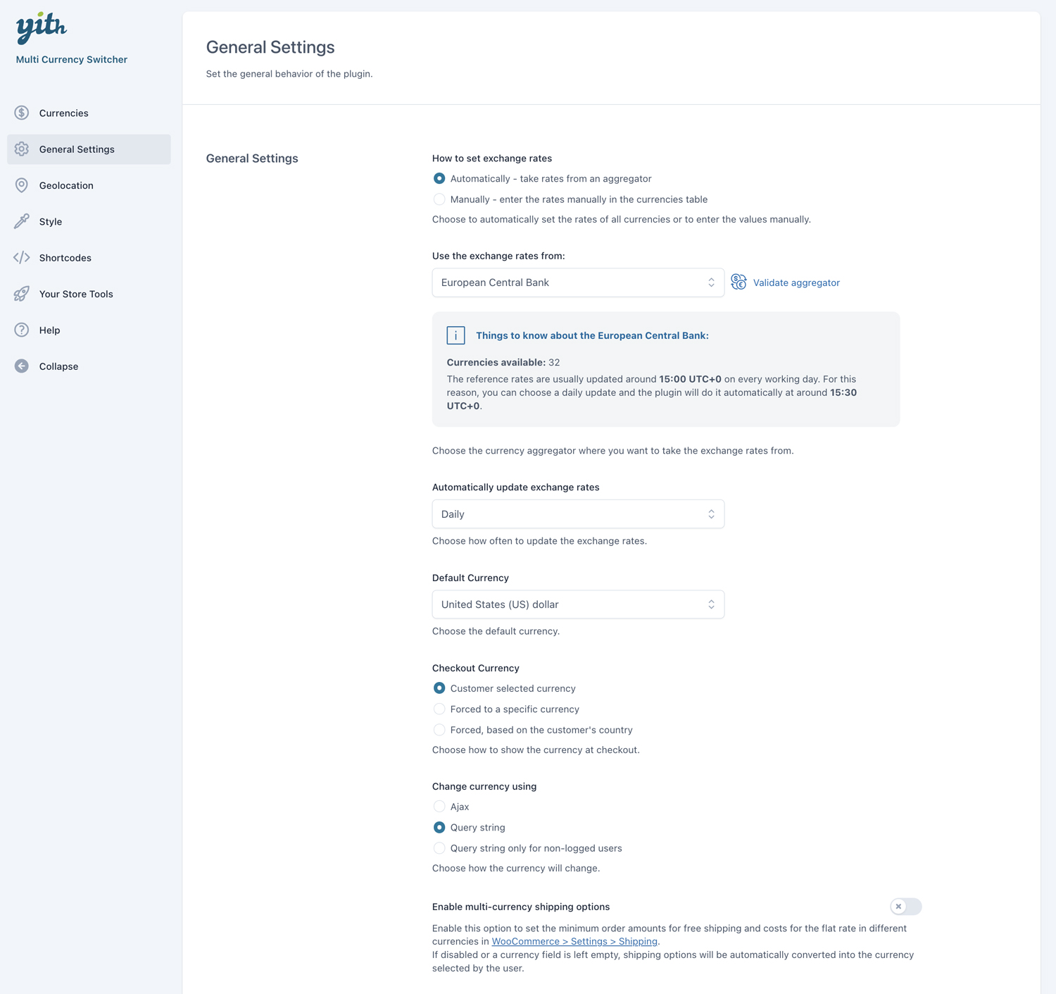 • Set exchange rates manually or use the API to update them automatically from different sources (like the European Central Bank)