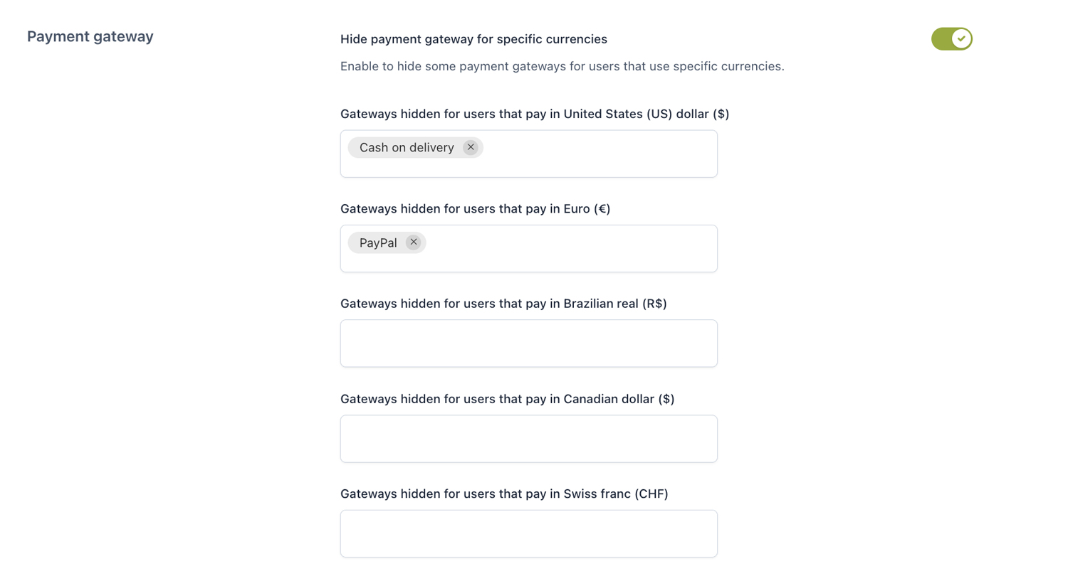 Do you want that users paying in USD can only pay with a credit card? Or those paying in pesos should not be able to view PayPal? The plugin gives you the possibility to disable the payment methods for specific currencies and have full control over the payment methods offered.
