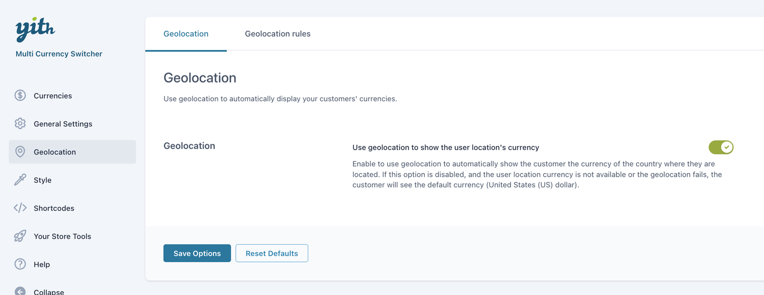 Create custom rules to choose which rules will be displayed by default to users based on their origin country and override the geolocation options. I.e. Do not show Argentinian users prices in their local currency (Argentine pesos), but show them in US dollars.