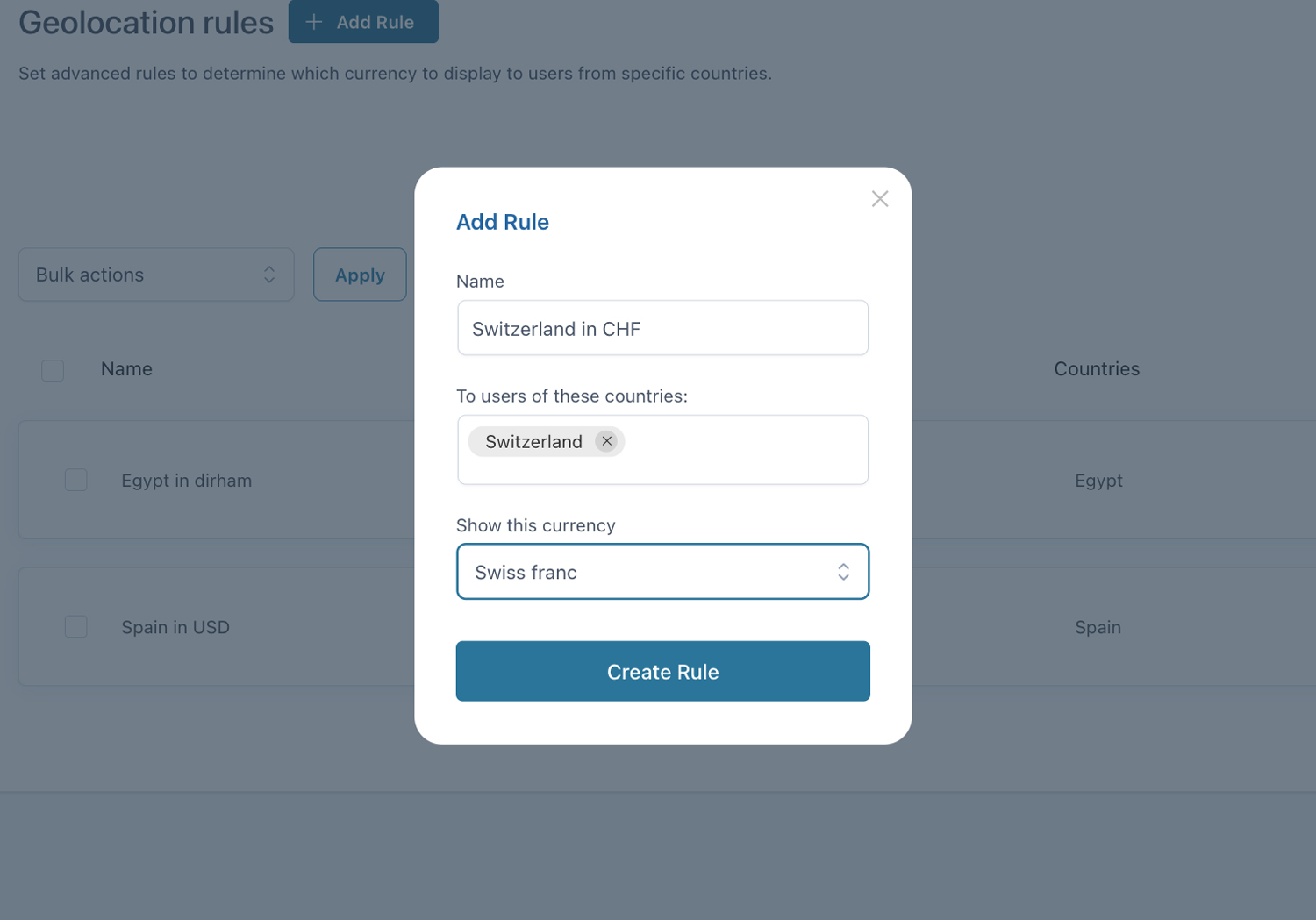 • Create custom rules to set which currencies need to be shown to users from specific countries;
