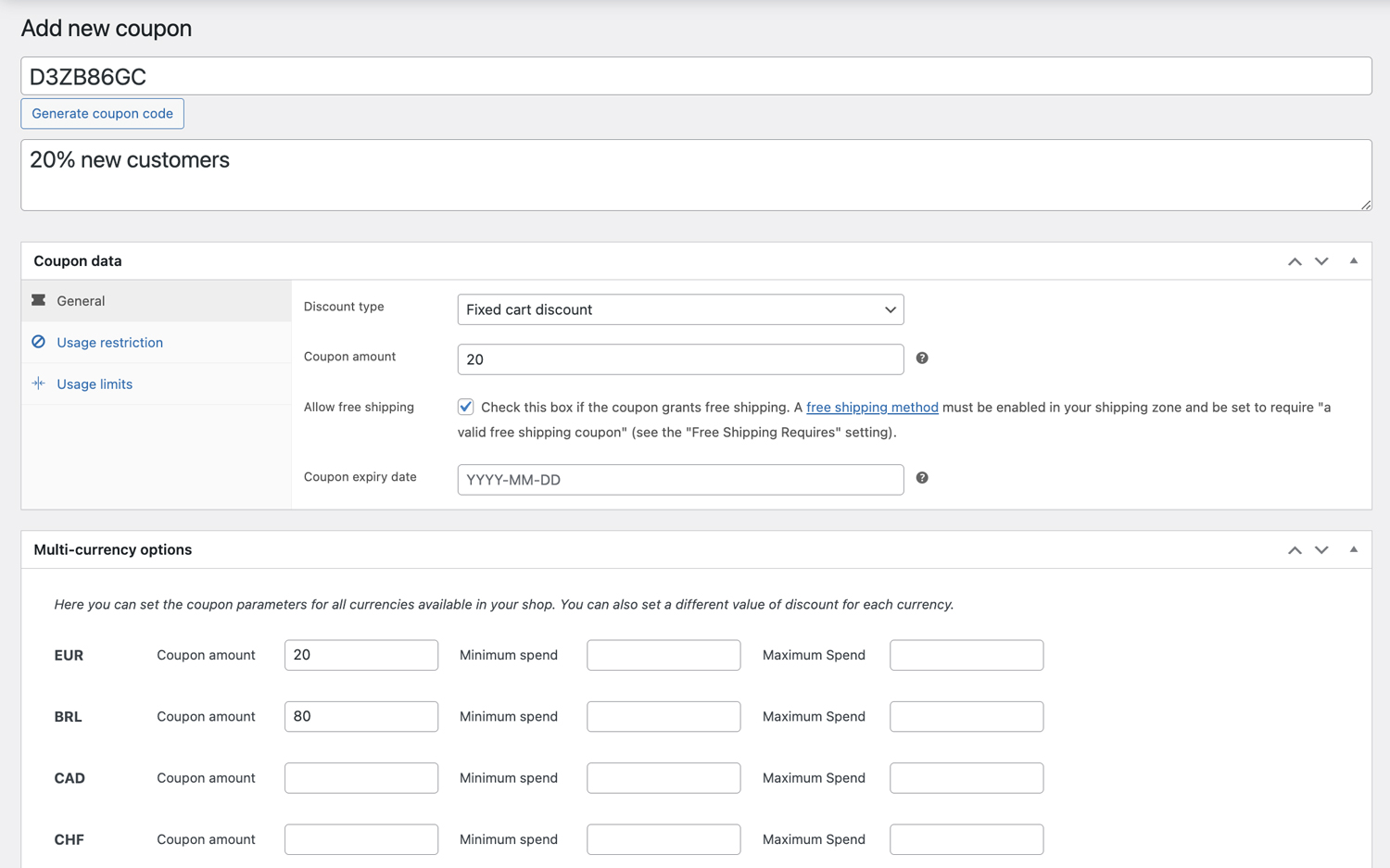 Configure the values of the coupon codes you create for every available currency, so you can create custom promotions for every currency.