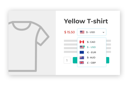 Users might find the action of changing the currency manually a bit frustrating. To improve your shop’s user experience, you can geolocate your users and show them their local currency in a totally automatic way. Users from the US will view prices in US dollars, users in the EU will view prices in Euros, and so on: the best way to make every customer feel comfortable.