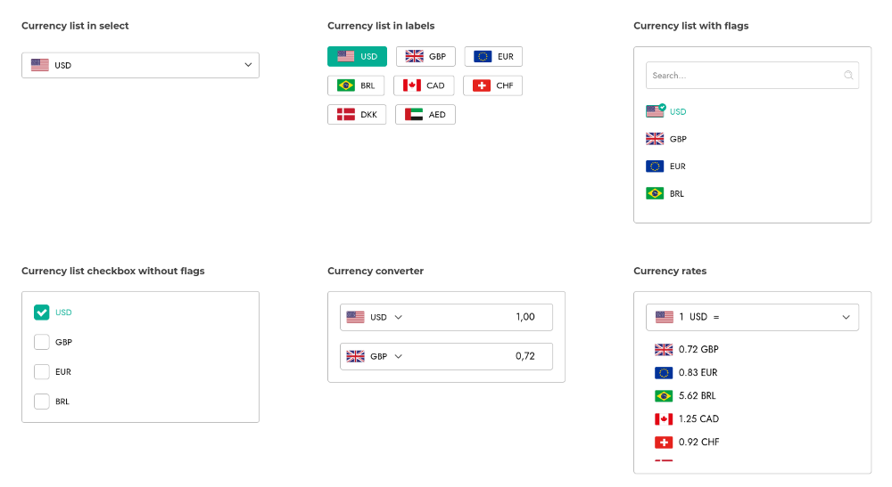Use shortcodes, widgets, and Gutenberg blocks to show a list of currencies and the switcher anywhere in your shop