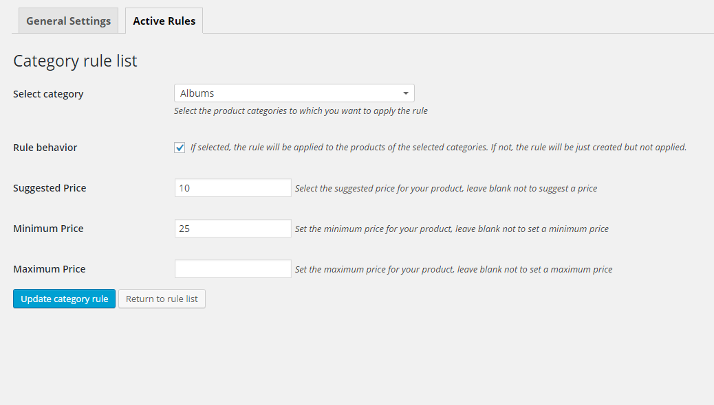 Yes, it is possible to configure the price settings you want to apply to specific product categories form the tab Active rules in the plugin settings.