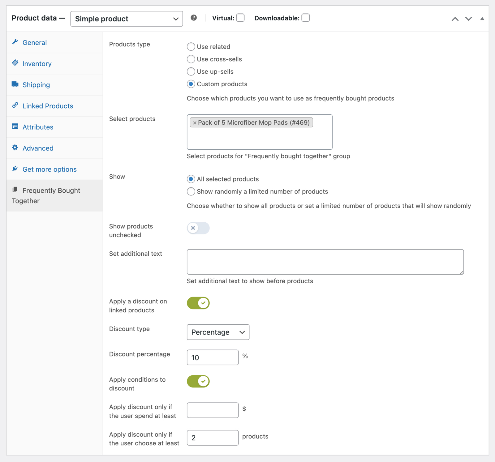 For each product, you can choose how many “Frequently bought together” items to display. For example, you can suggest five products and choose to show them all together or just a few at random to keep your customers’ attention on different products.