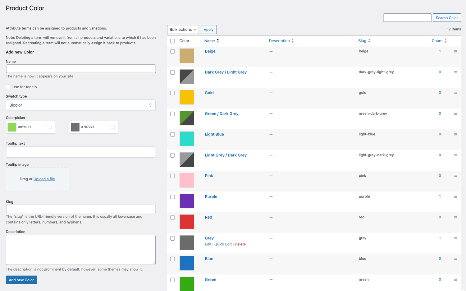 You can create color swatches with only one color or use the “bicolor” option to create samples with two colors. This option is useful if you sell products that have two dominant colors and you want to consistently show them to your users.